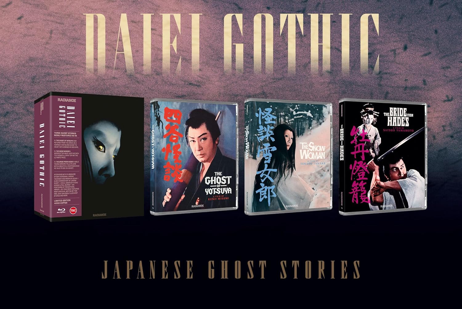 | The Ghost of Yotsuya – New interview with filmmaker Kiyoshi Kurosawa – A visual essay on the history and adaptations of the classic Ghost of Yotsuya story by author Kyoko Hirano – Trailer The Bride From Hades – Audio commentary by author Jasper Sharp – New interview with filmmaker Hiroshi Takahashi – Trailer The Snow Woman – New interview with filmmaker Masayuki Ochiai – A visual essay on writer Lafcadio Hearn by Paul Murray – Trailer |