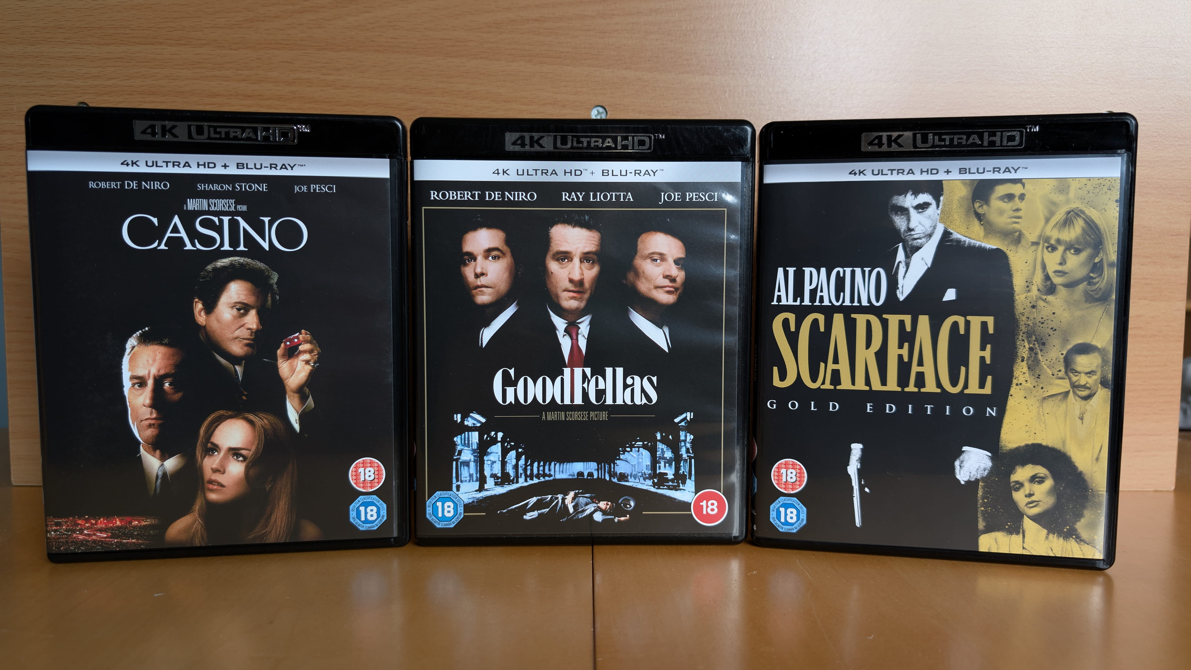 So yes, I now own Martin Scorsese’s 1995 film Casino, starring Robert De Niro, Sharon Stone, and Joe Pesci, Martin Scorsese’s 1990 film Goodfellas, starring Robert De Niro, Ray Liotta, and Joe Pesci, and Brian De Palma’s 1983 film Scarface, starring Al Pacino, on 4K Ultra HD as well.