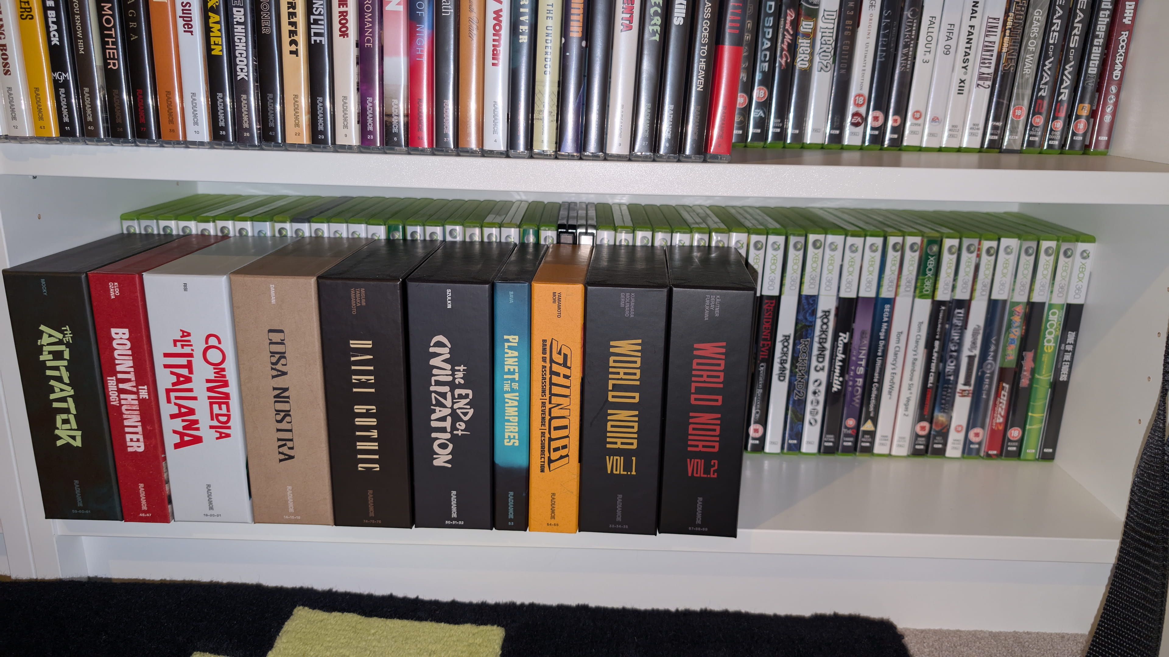 In front of the Xbox 360 collection on the seventh and eighth rows is my Radiance Films collection, the only non-video game related portion on my shelf. On the seventh row are the limited edition non-rigid box releases and on the eighth row are the limited edition rigid box releases.