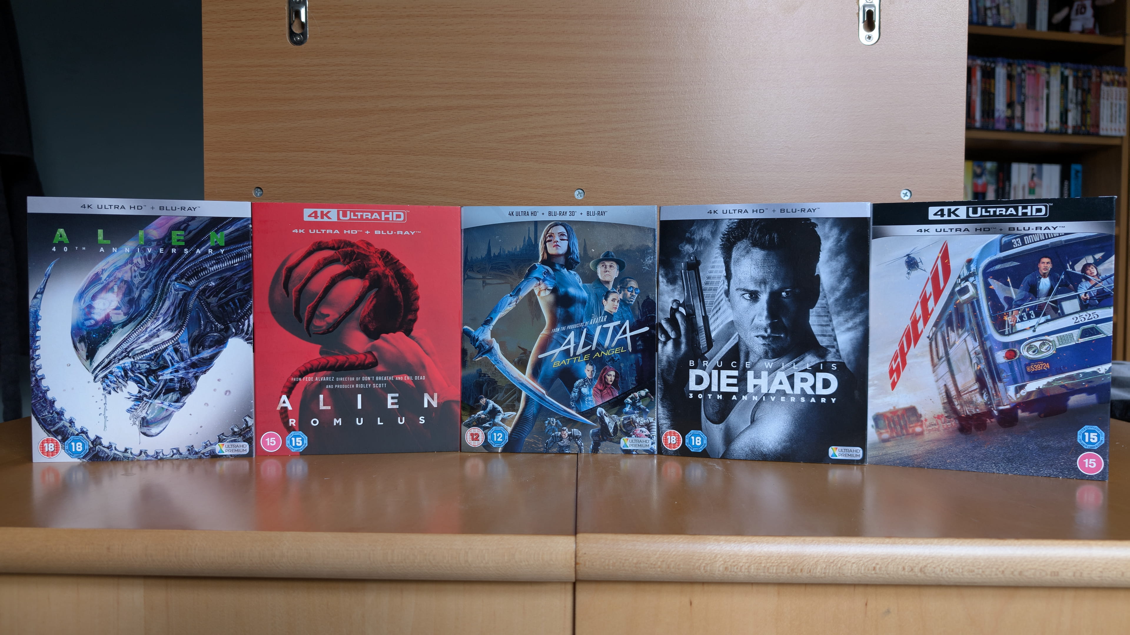 The rest came from HMV’s 2 for £30 deal which I don’t make much use of in all honestly, but here they were a special case. Pretty much each of these came with slipcases given the age of when they first came out so I figured why not make use of them. We have Ridley Scott’s 1979 film Alien, Robert Rodriguez’s 2019 film Alita: Battle Angel, John McTiernan’s 1988 film Die Hard, and Jan de Bont’s 1994 film Speed.