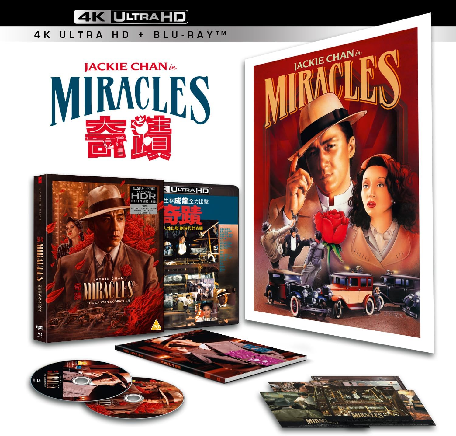 | – Brand-new 4K restoration from the Original Camera Negative presented in original 2.35:1 Aspect Ratio – Includes both the Original Hong Kong cut (Mr Canton & Lady Rose – 127 mins) and the International cut (Miracles aka Black Dragon – 107 mins) – 4K Ultra HD disc: Presented in Ultra High Definition (2160p) with Dolby Vision (HDR10 Compatible) – Blu-ray disc: High Definition (1080p) Blu-ray presentation – Remastered Original Cantonese Mono Soundtrack – Alternate Cantonese Mono Soundtrack featuring a unique mix and different music cues – Cantonese Mono – Home Video Mix – Cantonese 5.1 – Newly-translated English Subtitles and SDH [optional] – Classic English Dub for the International cut with optional SDH |