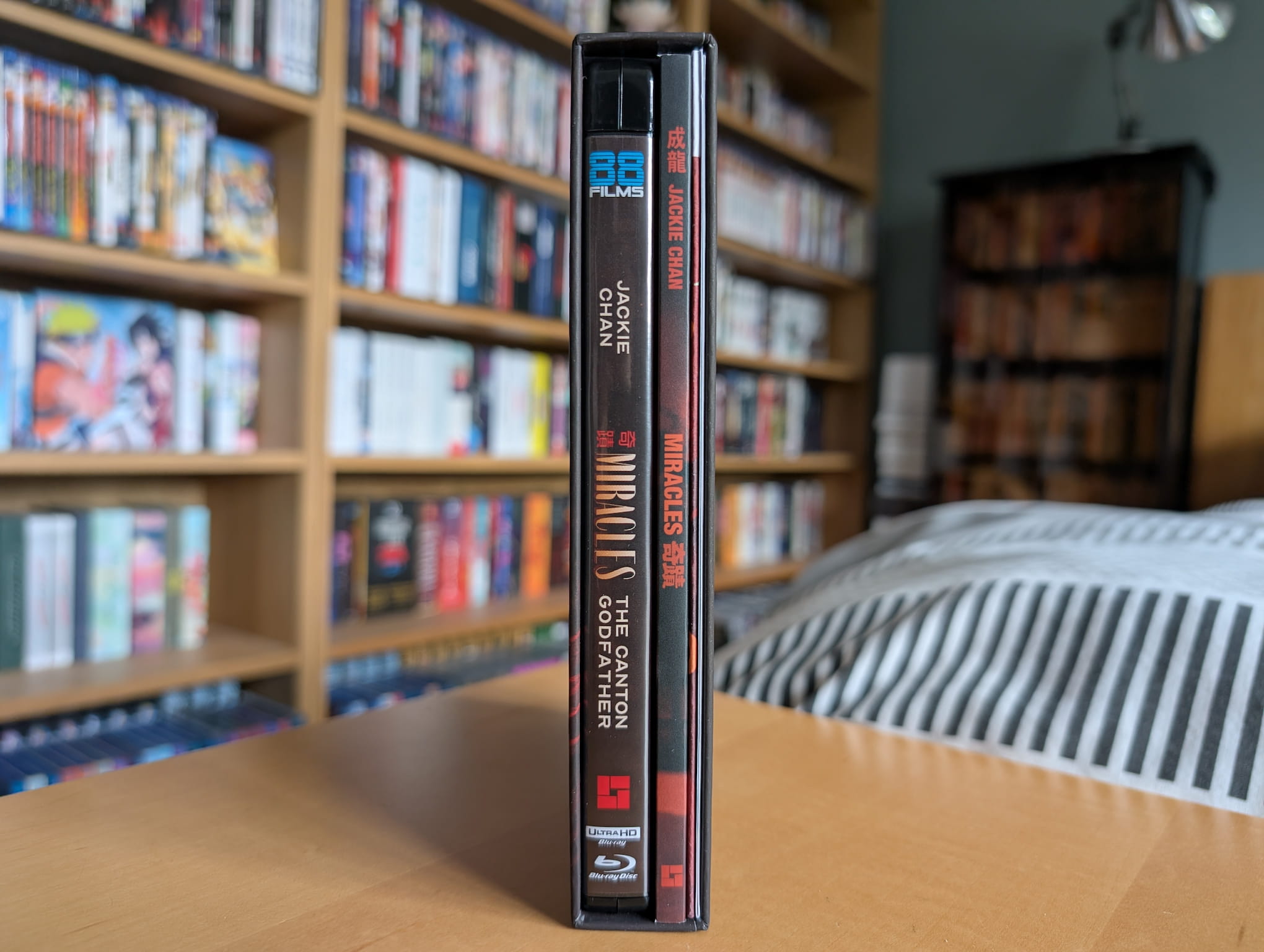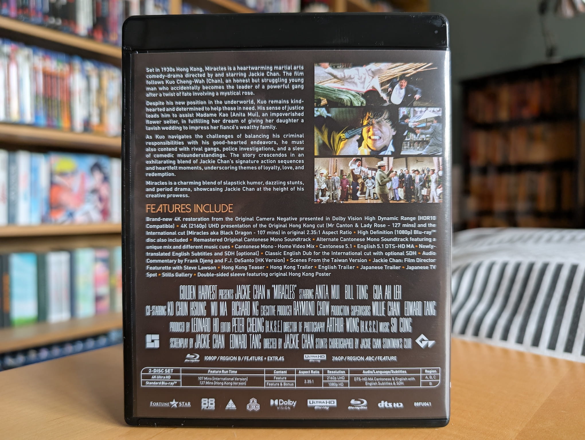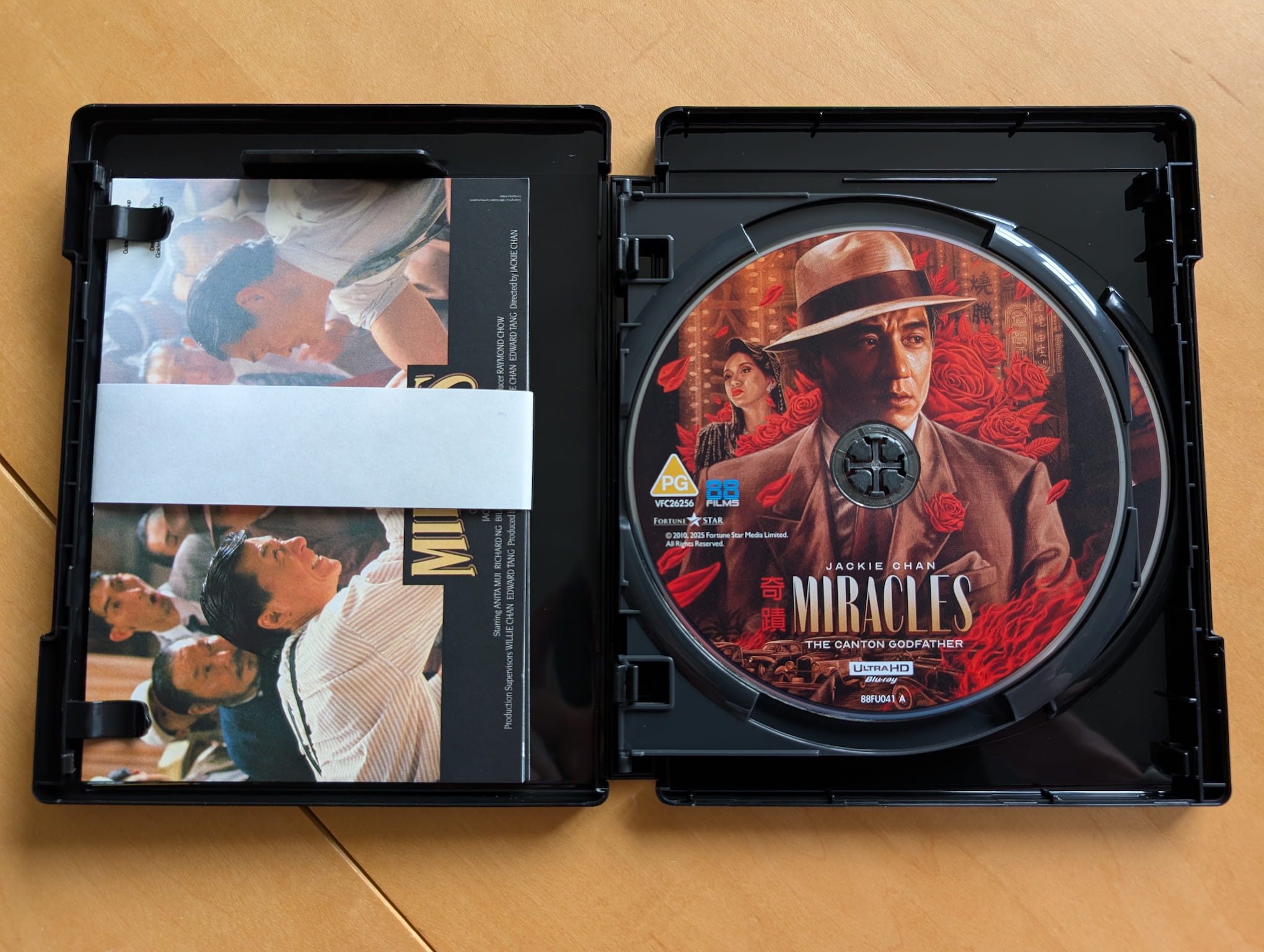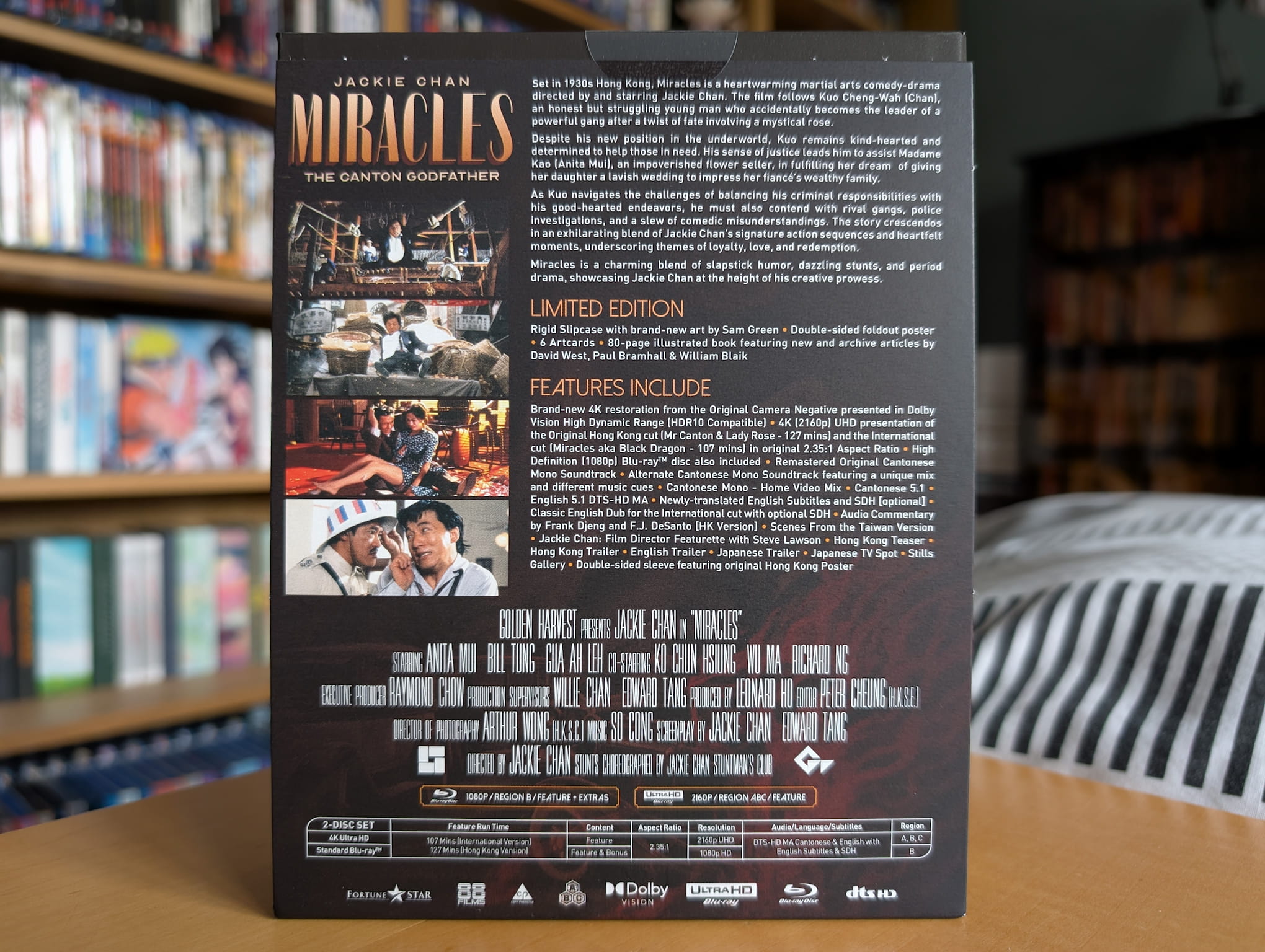 The deluxe limited edition release for Miracles: The Canton Godfather contains the film on a single 4K Ultra HD disc and a single Blu-ray disc. All the discs were encoded and authored by Fidelity in Motion on behalf of 88 Films.