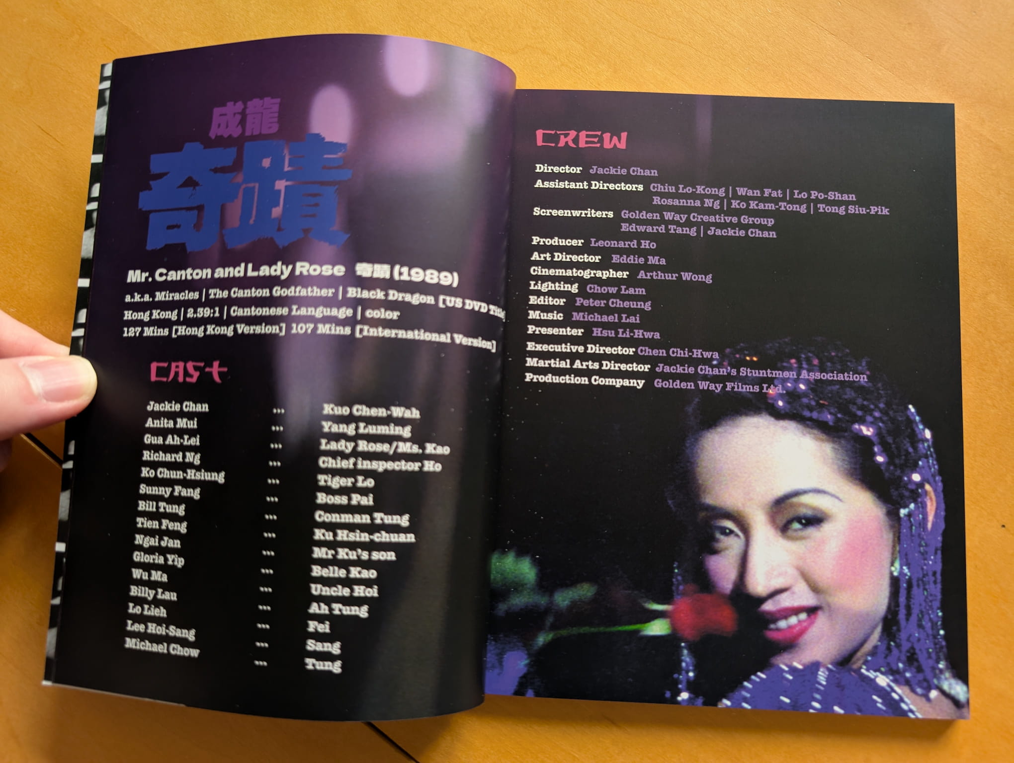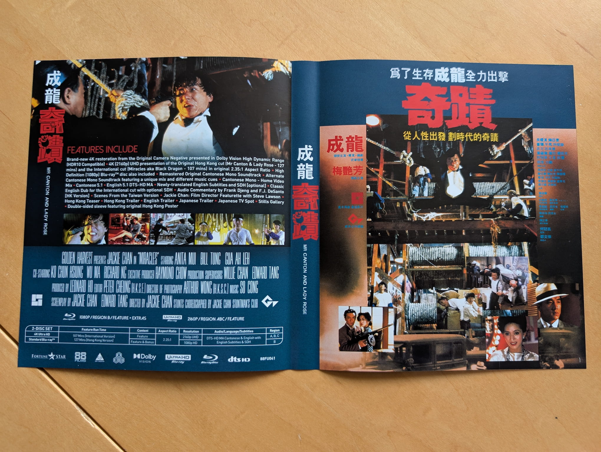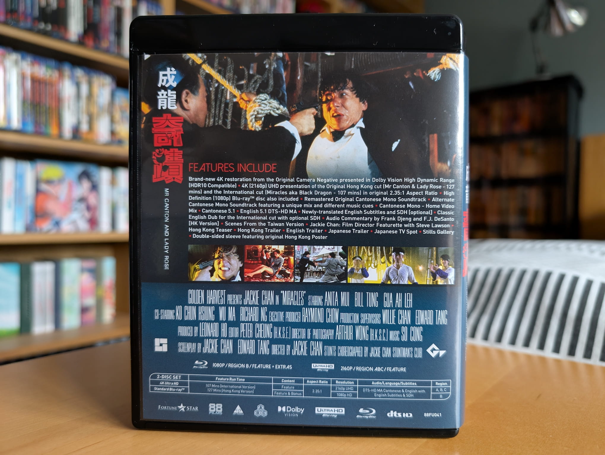 This release features two versions of the film; the 127 min Original Hong Kong cut (known as Mr Canton & Lady Rose) in Cantonese audio with newly-translated English subtitles and the classic English dub, and the 107 min International cut (known as Miracles aka Black Dragon) in English audio (using the classic English dub) with English SDH subtitles, both using a ‘brand-new’ 4K restoration from the Original Camera Negative.