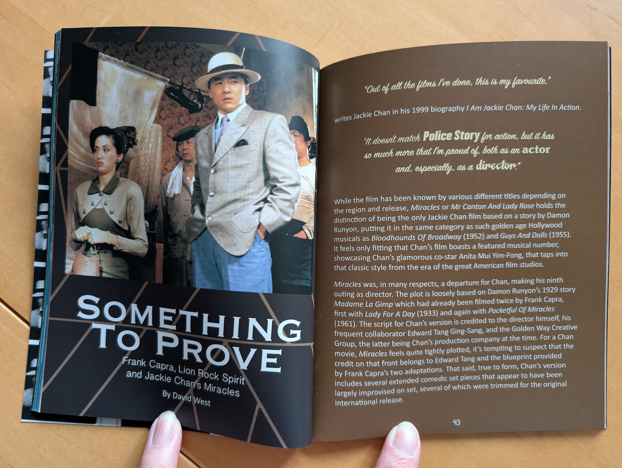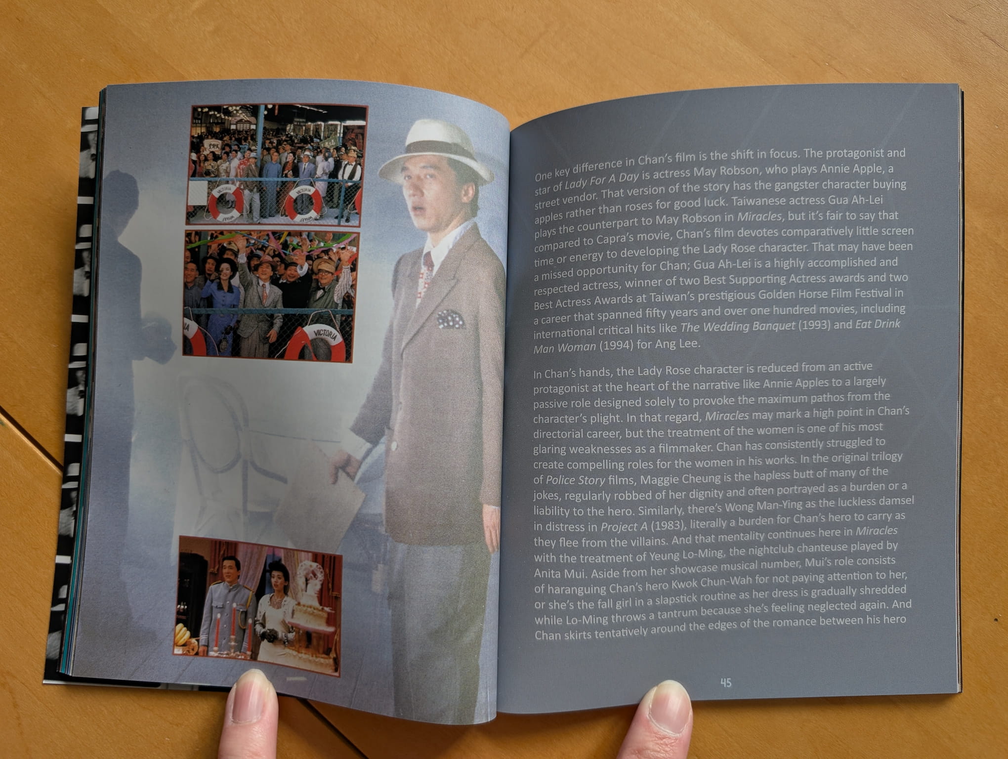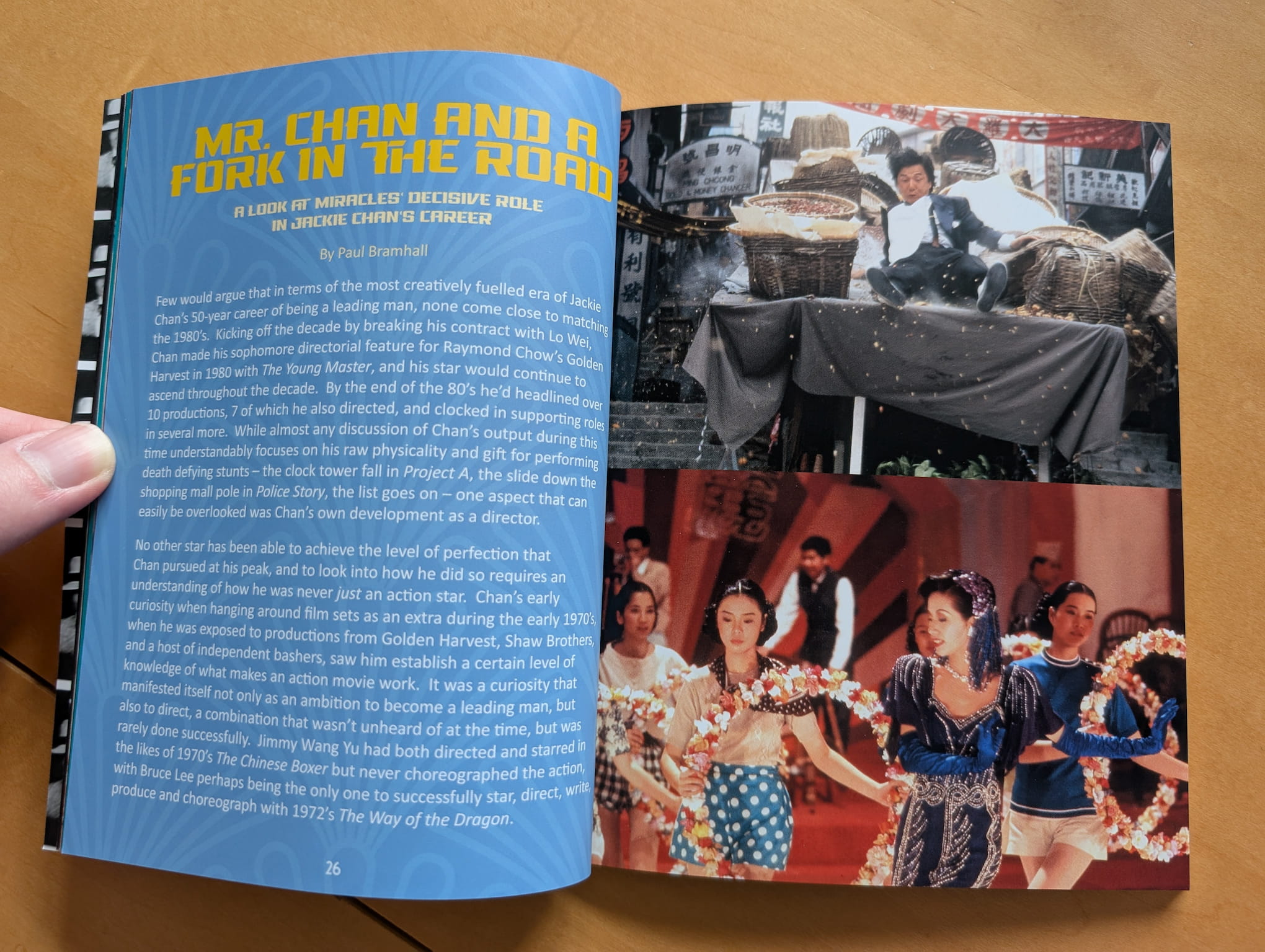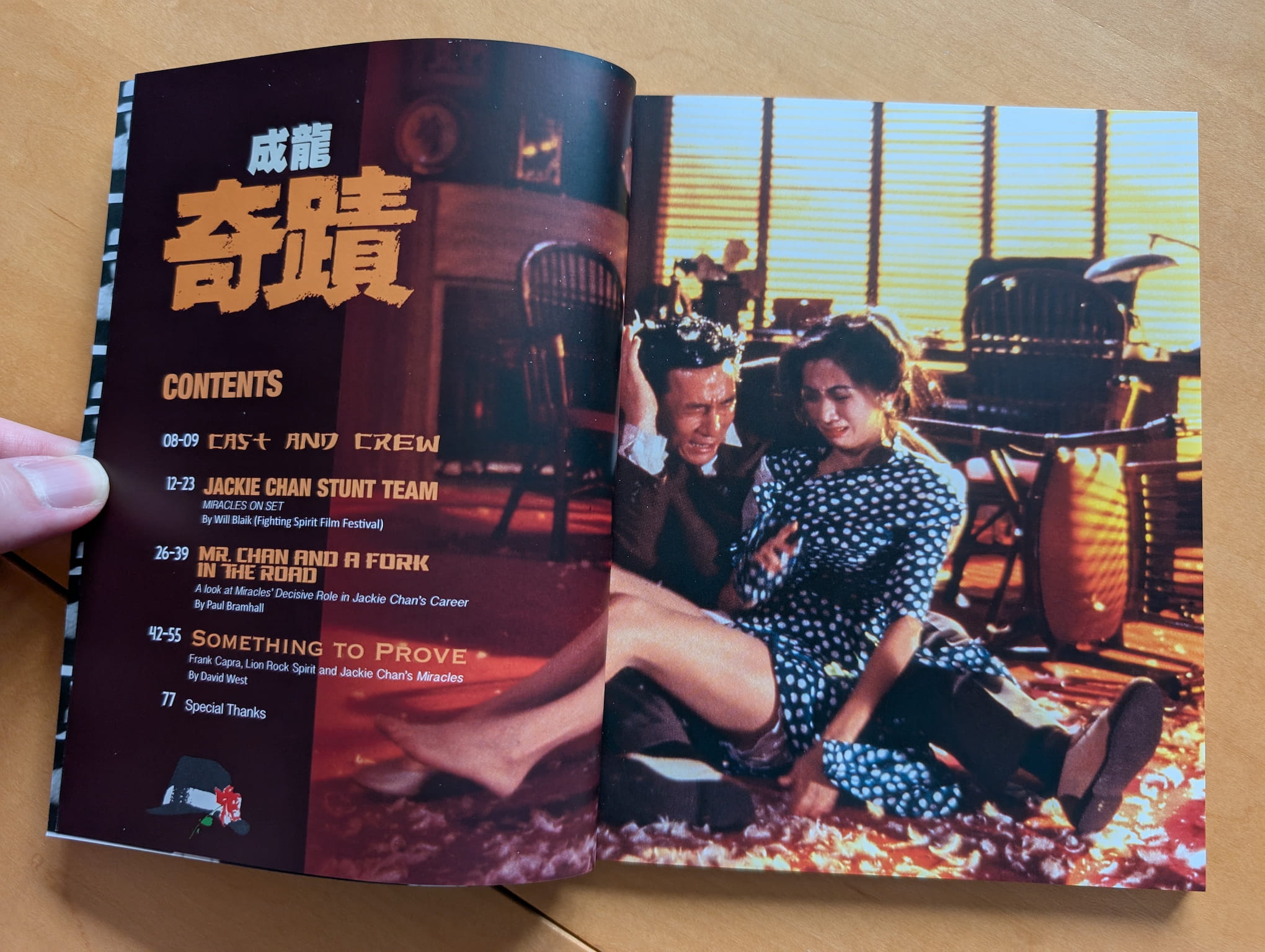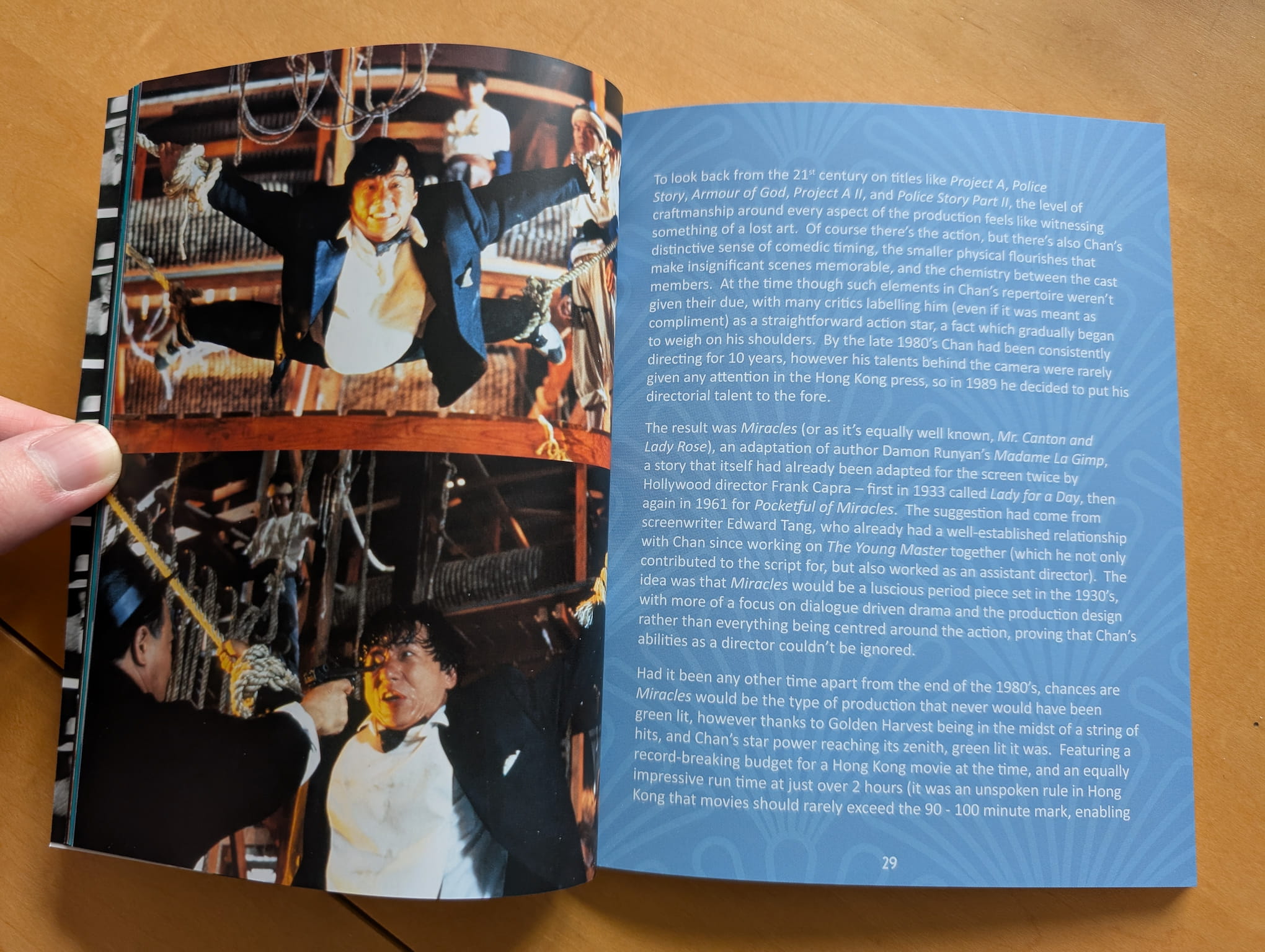 This deluxe limited edition release is presented with a rigid slipcase containing a 4K amaray case housing the discs and art cards, a double-sided poster and an 80-page illustrated booklet featuring new and archived articles. The articles covered are ‘Jackie Chan Stunt Team: Miracles on Set’ by William Blaik (Fighting Spirit Film Festival), ‘Mr. Chan and a Fork in the Road: A Look at Miracles’ Decisive Role in Jackie Chan’s Career’ by Paul Bramhall, and ‘Something to Prove: Frank Capra, Lion Rock Spirit and Jackie Chan’s Miracles’ by David West.