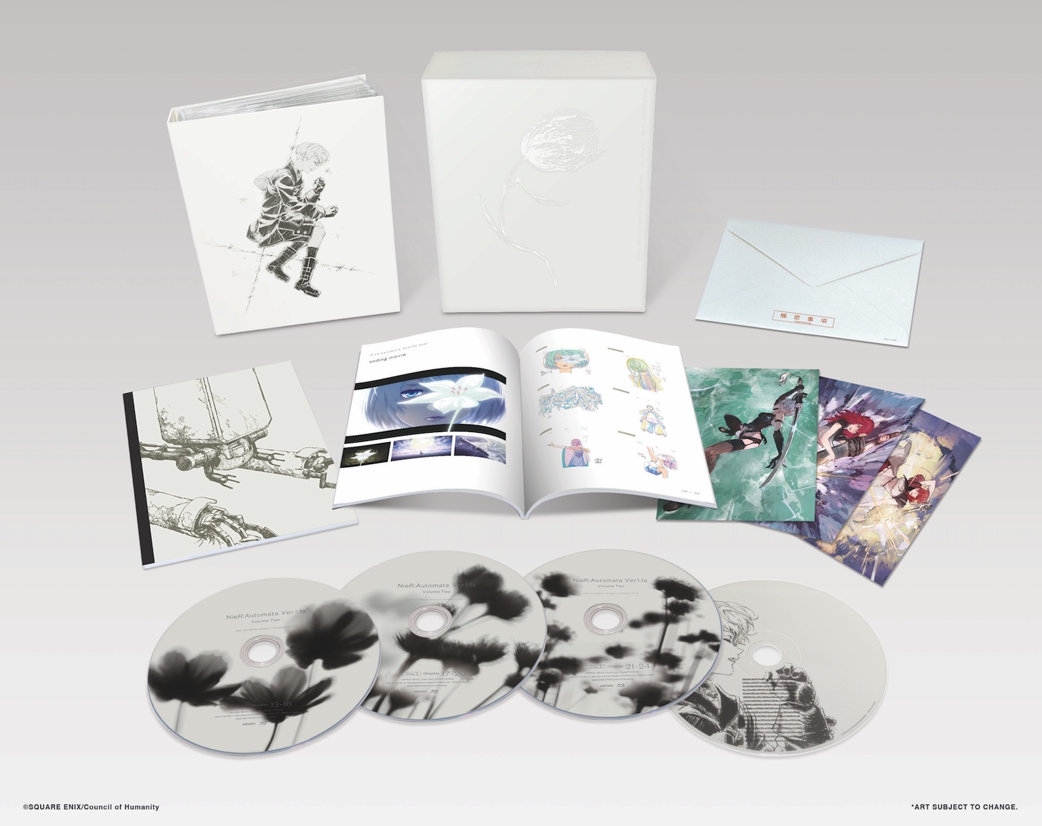 | – Trailer Collection – Textless OP/EDs | – Rigid Box with Digibook packaging – Series Reference Booklet “Elements of NieR:Automata Ver1.1a 002” – Illustrated Guide Booklet “POD’s Records 002” – Replica Disc – Exclusive Illustration Cards |
