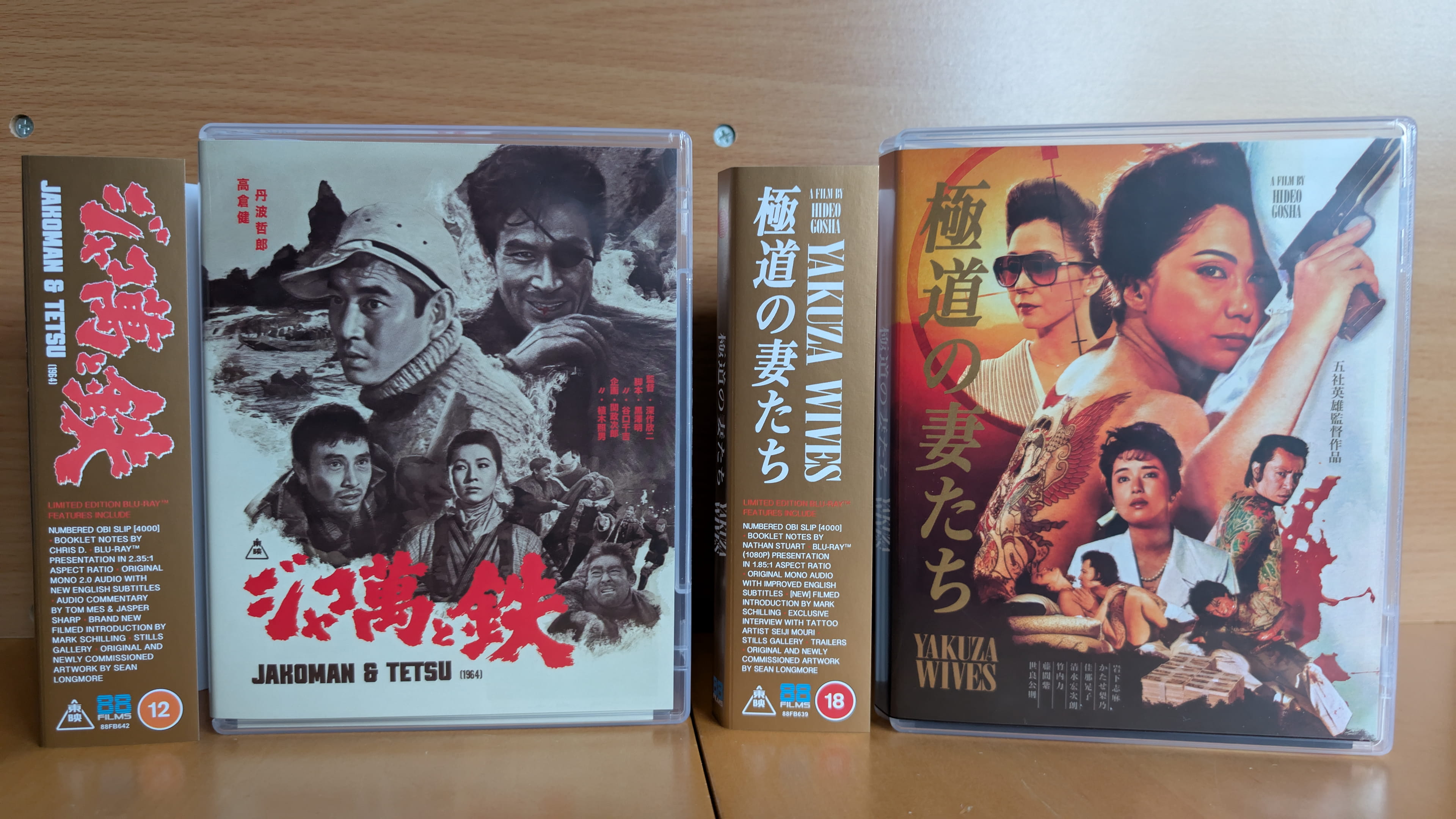 For the Japanarchy collection, there’s Kinji Fukasaku’s 1964 film Jakoman and Tetsu (ジャコ萬と鉄), which is one of his earlier films in the filmography, releasing the same year as his Yakuza film Wolves, Pigs and Men. And Hideo Gosha’s 1986 film Yakuza Wives (極道の妻たち), which was made during the latter part of his film career. Both are presented with a Scanavo case, a removable OBI strip, reversible covers featuring the original Japanese poster artwork, and a booklet which includes an essay about the film and its director.