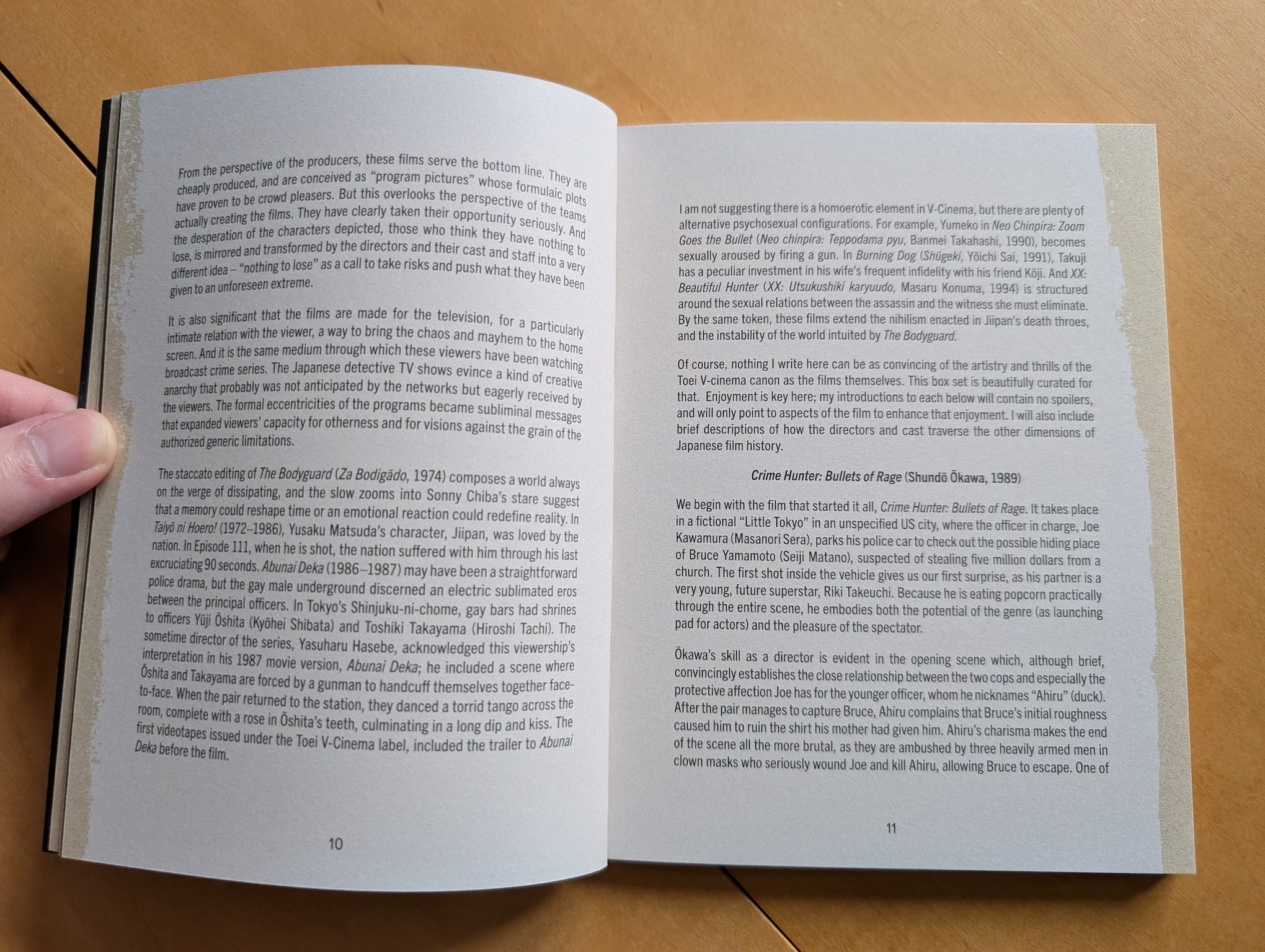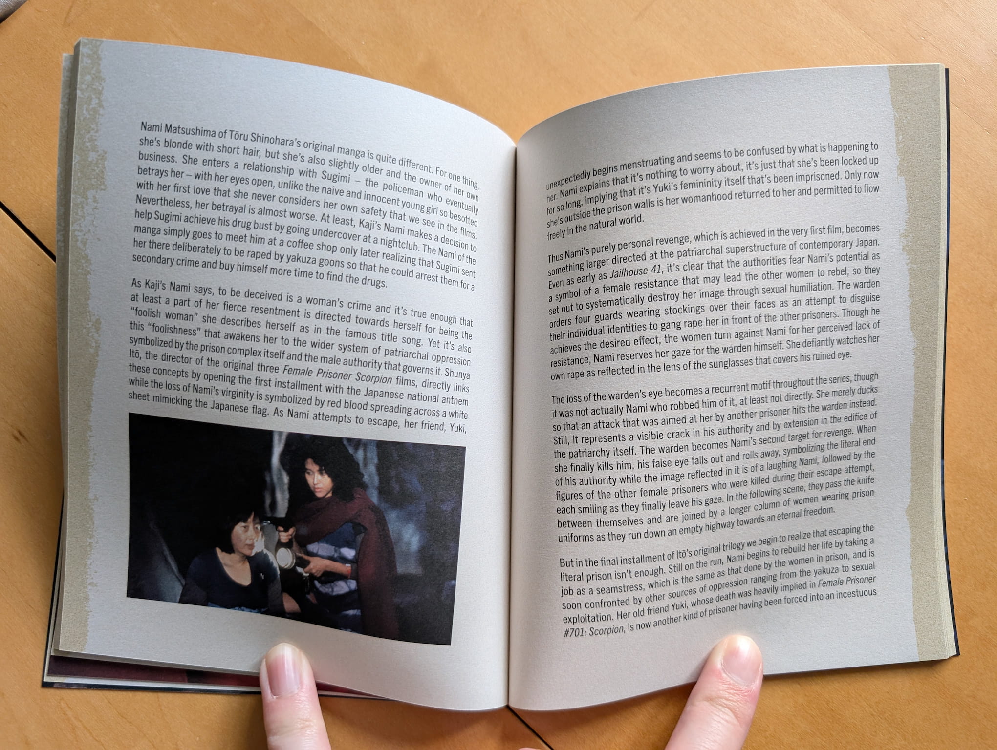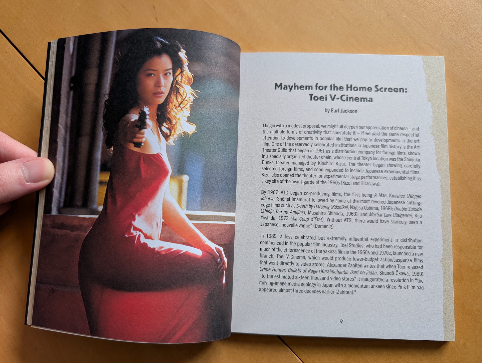 The book contains information about the V-Cinema series across a few essays; “Mayhem for the Home Screen: Toei V-Cinema” by Earl Jackson, “Susurrations of Sasori: Female Prisoners and the Ghost of Resistance” by Hayley Scanlon, and “DriVe My Car: The Speed of Toei V-Cinema” by Daisuke Miyao.