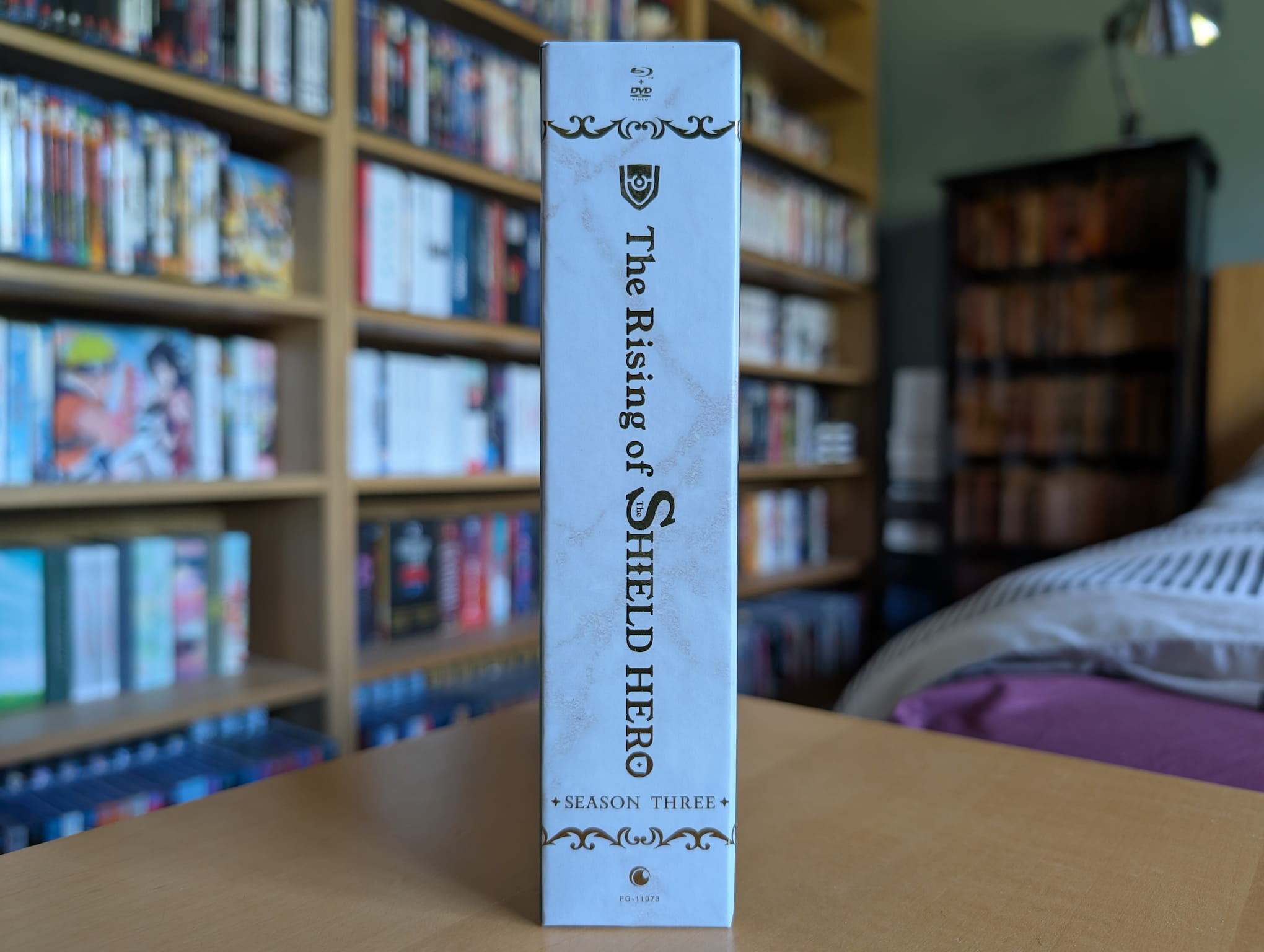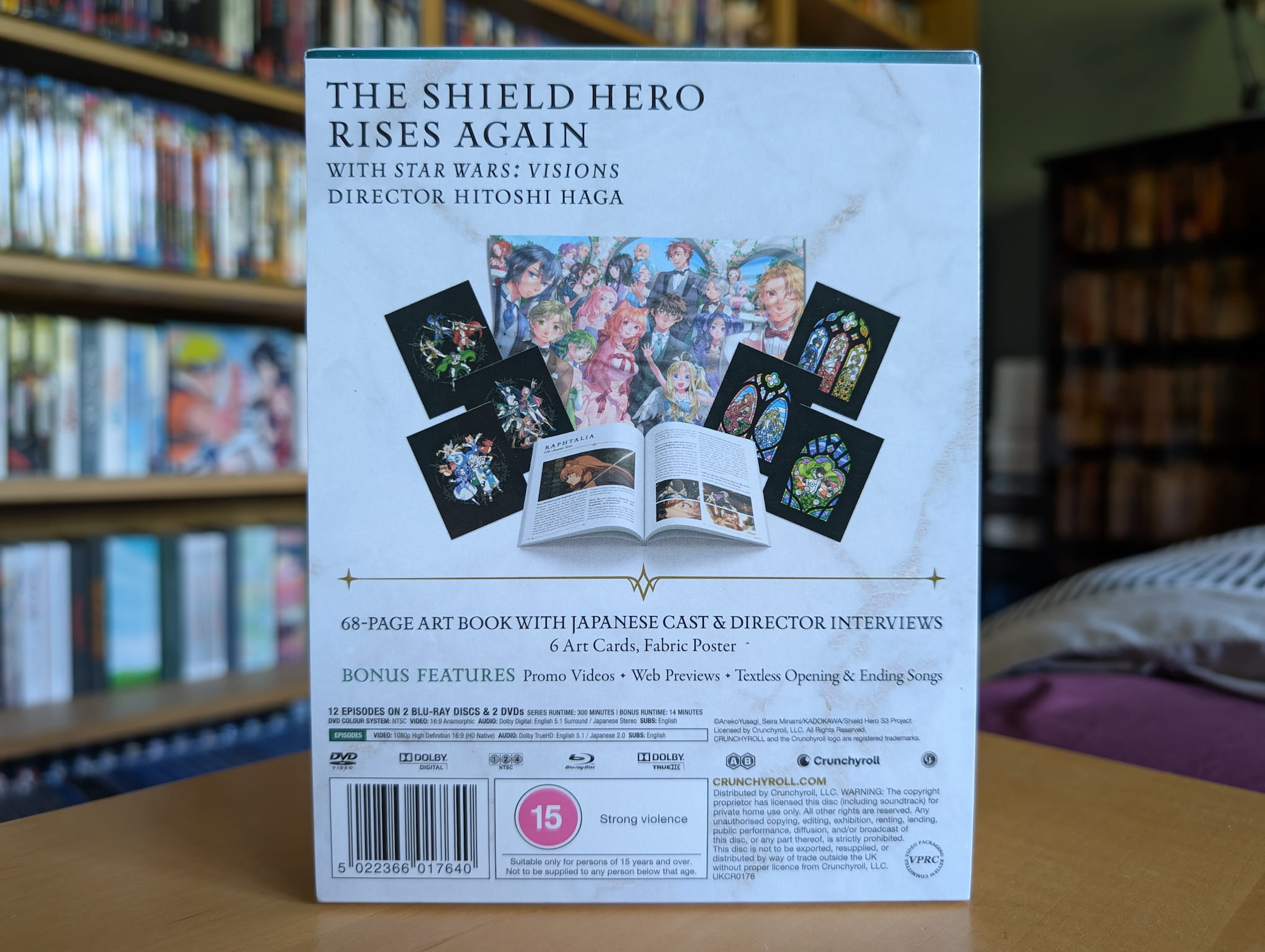 The limited edition release for The Rising of the Shield Hero Season 3 contains the entire season, episodes 1-12, across two Blu-ray discs and two DVD discs. The discs were authored and encoded by Crunchyroll.