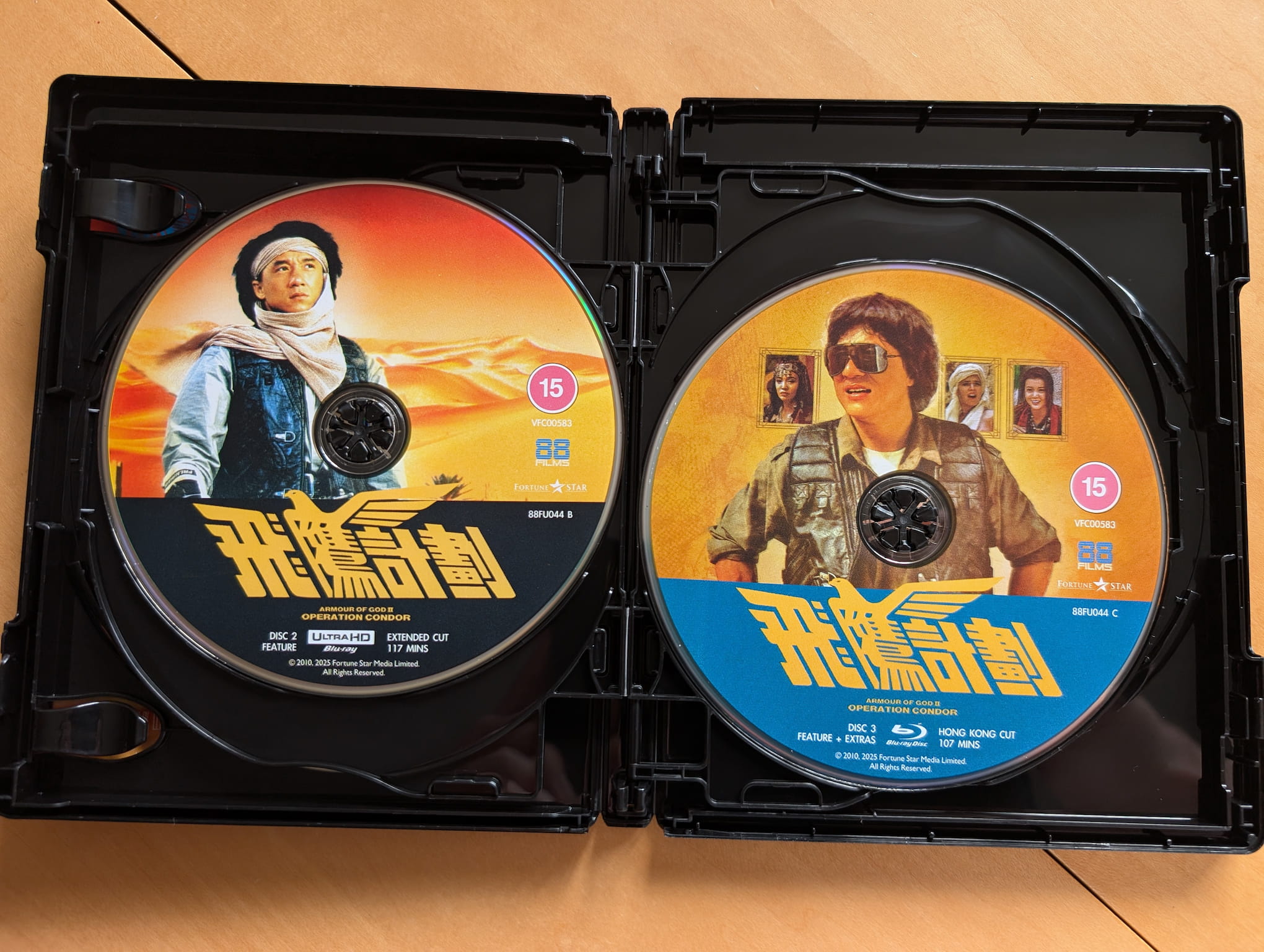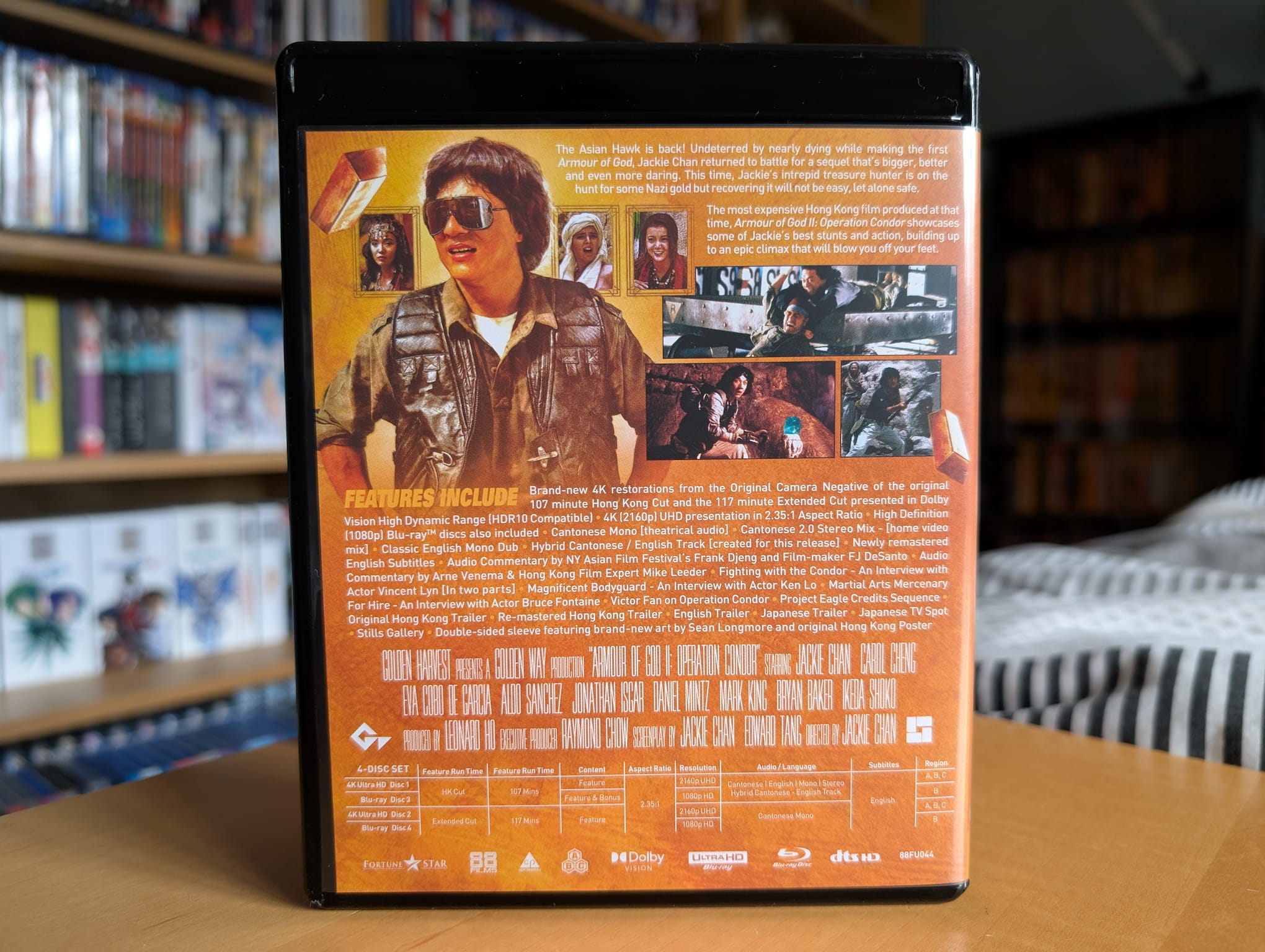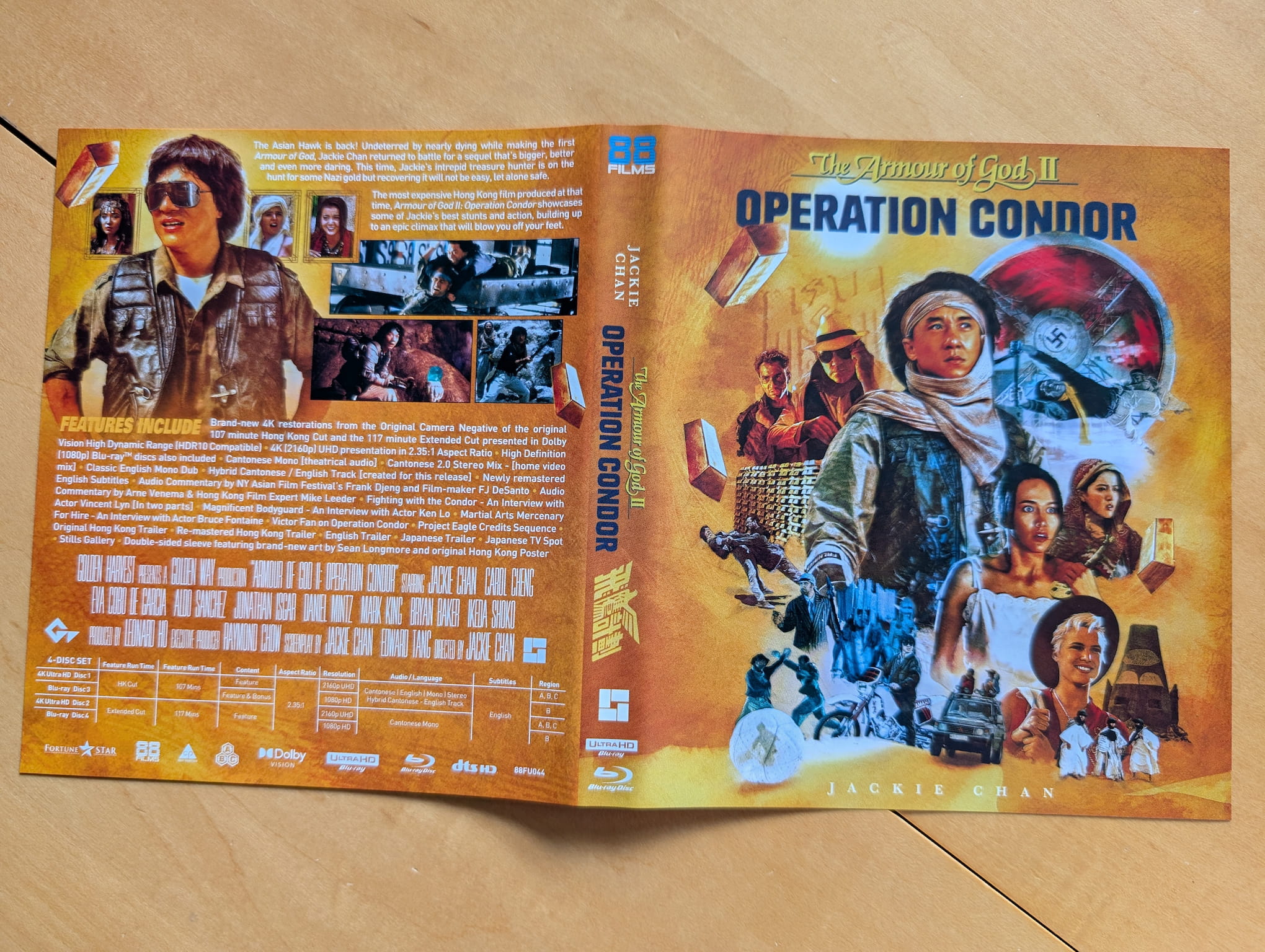 The deluxe limited edition release for Armour of God II: Operation Condor contains the film on two 4K Ultra HD discs and two Blu-ray discs. All the discs were encoded and authored by MJM Multimedia on behalf of 88 Films. This release features two versions of the film on separate discs, both using a ‘brand-new’ 4K restoration from the Original Camera Negative.