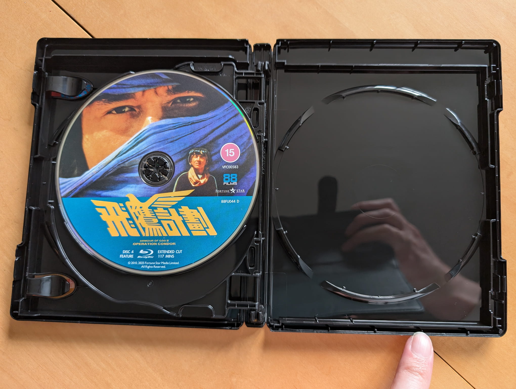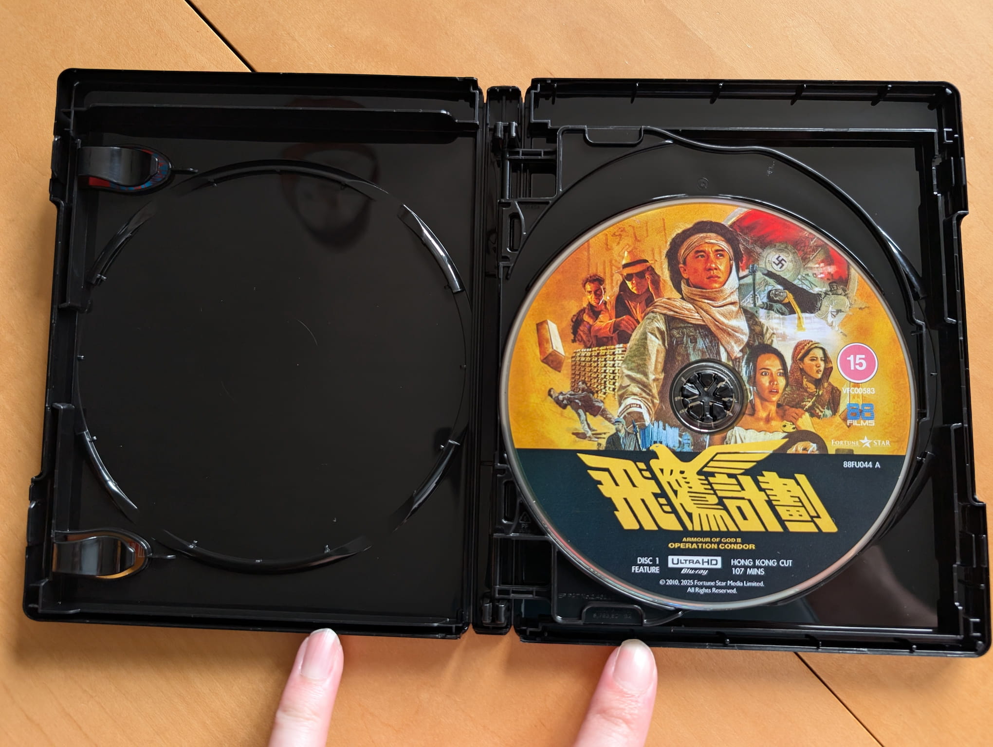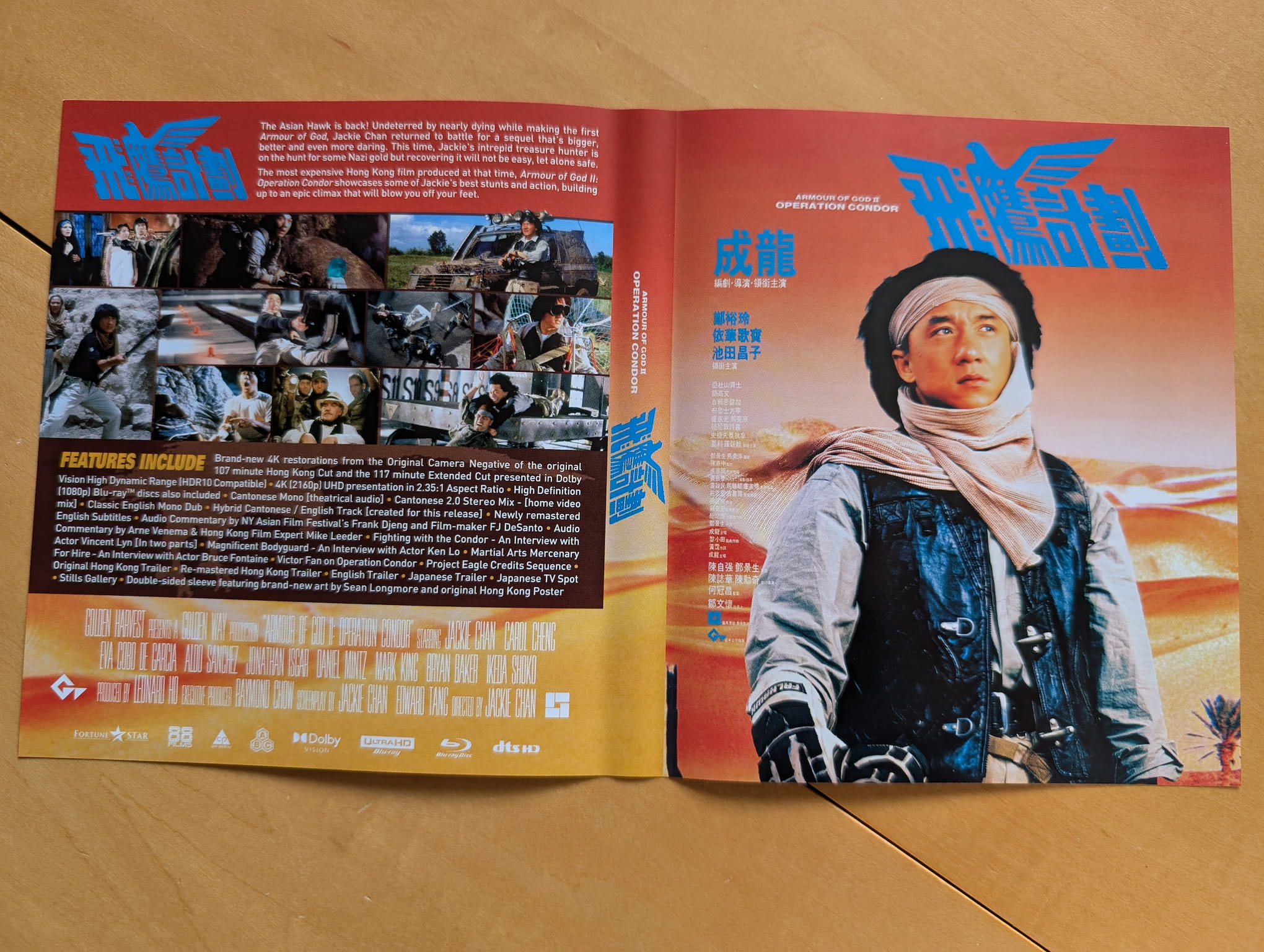 The deluxe limited edition release for Armour of God II: Operation Condor contains the film on two 4K Ultra HD discs and two Blu-ray discs. All the discs were encoded and authored by MJM Multimedia on behalf of 88 Films. This release features two versions of the film on separate discs, both using a ‘brand-new’ 4K restoration from the Original Camera Negative.