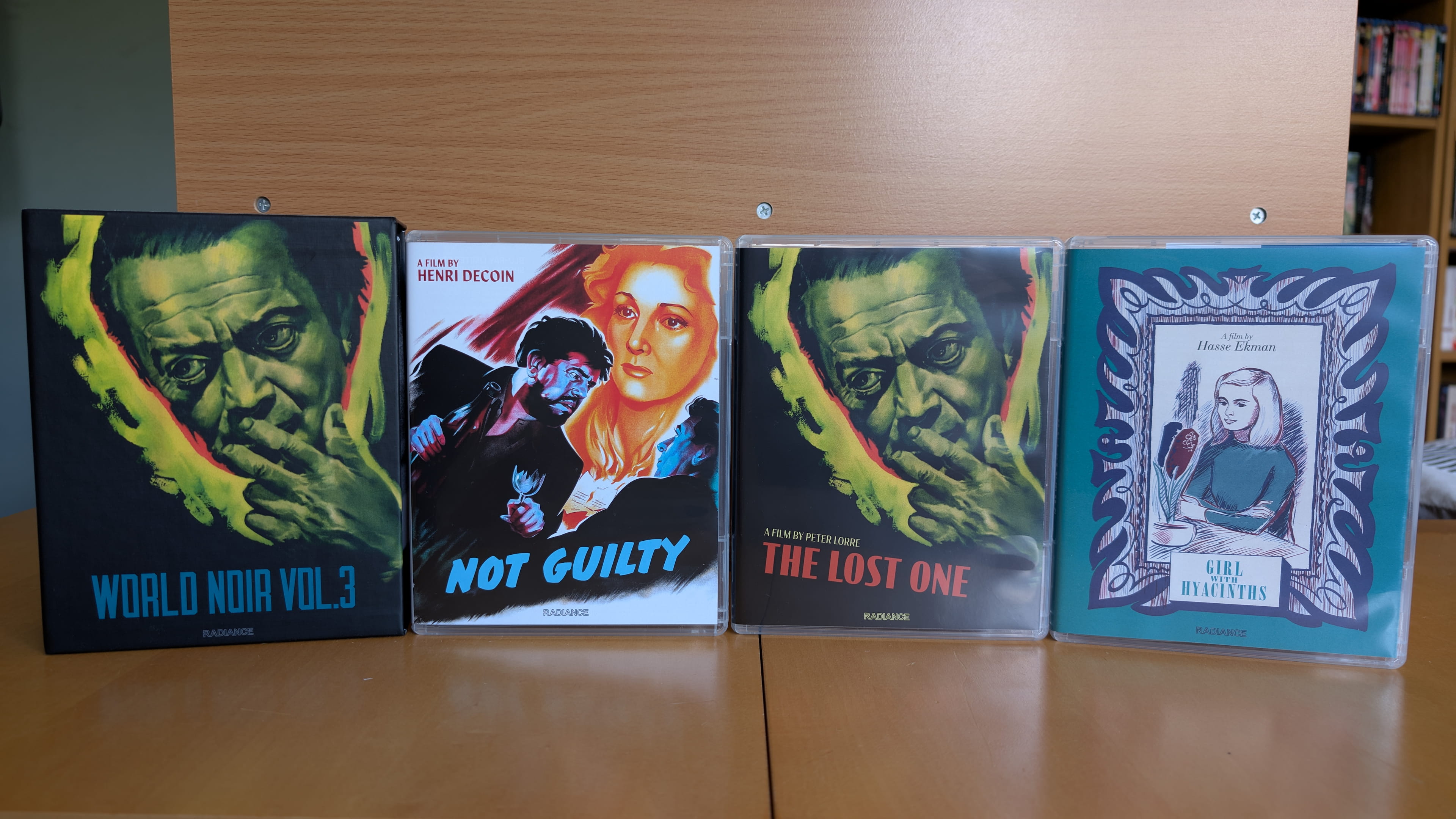 Finally we have World Noir Volume 3, which brings us more European noir classics from the 40-50s era. There’s no Asian film this time around but what we do have are Henri Decoin’s Not Guilty (Non coupable) released in France, 1947, Peter Lorre’s The Lost One (Der Verlorene) released in Germany, 1951, & Hasse Ekman’s Girl with Hyacinths (Flicka och Hyacinter) released in Sweden, 1950. I read that Peter Lorre is a pretty famous actor so I’m intrigued by his film in this set. The limited edition release includes a rigid box, a booklet, scanavo packaging and reversible artwork. A fourth volume is also being released fairly soon that is mainly centred on French films.