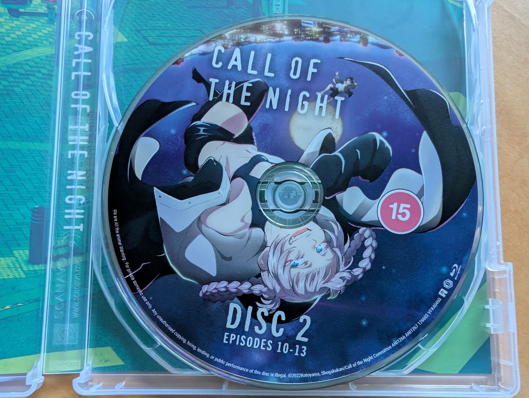 The collector’s edition Blu-ray release for Call of the Night Season 1 contains all 13 episodes across two Blu-ray discs, with the encode and authoring done by Sentai Filmworks via their September 2023 release.
