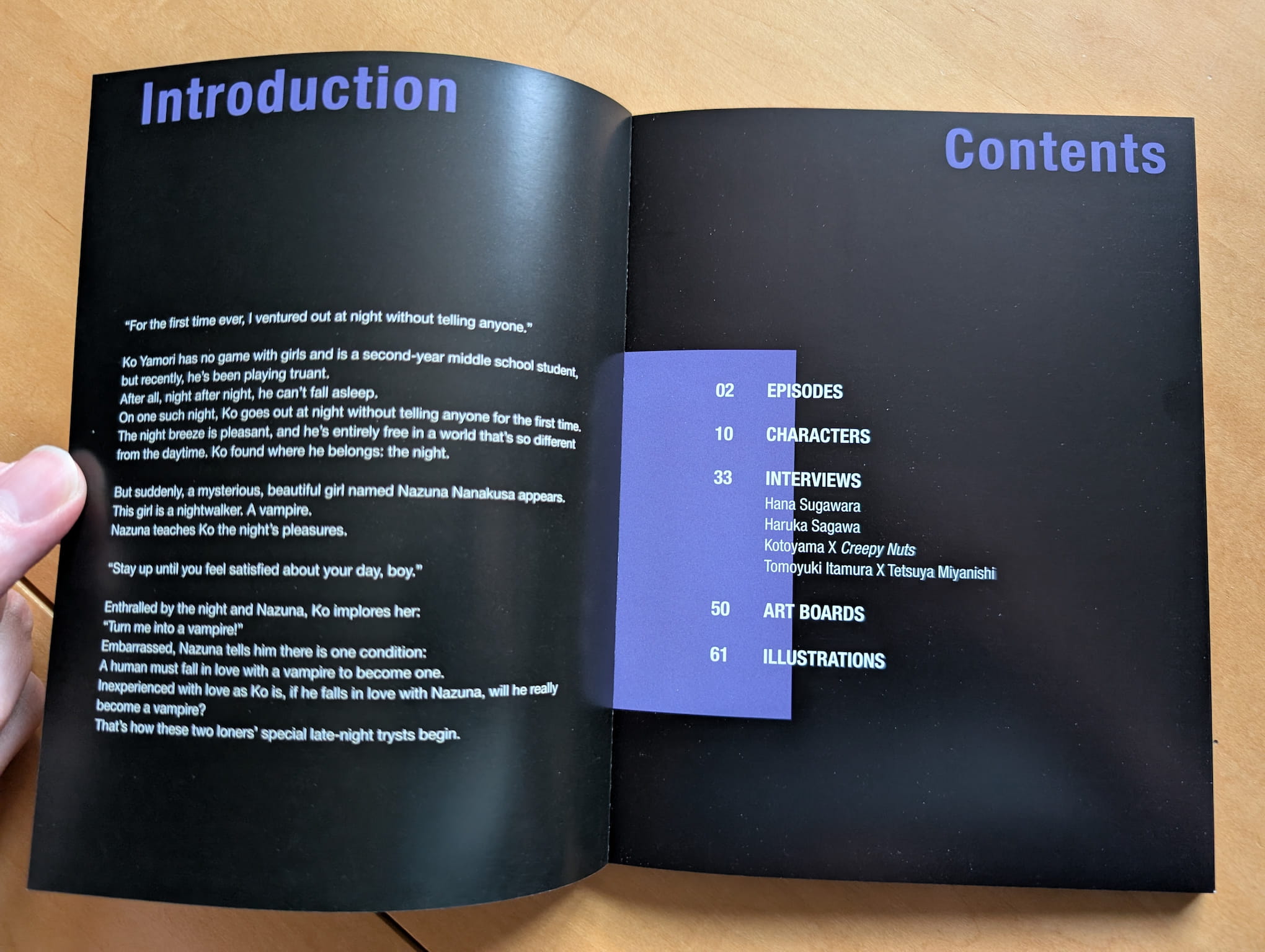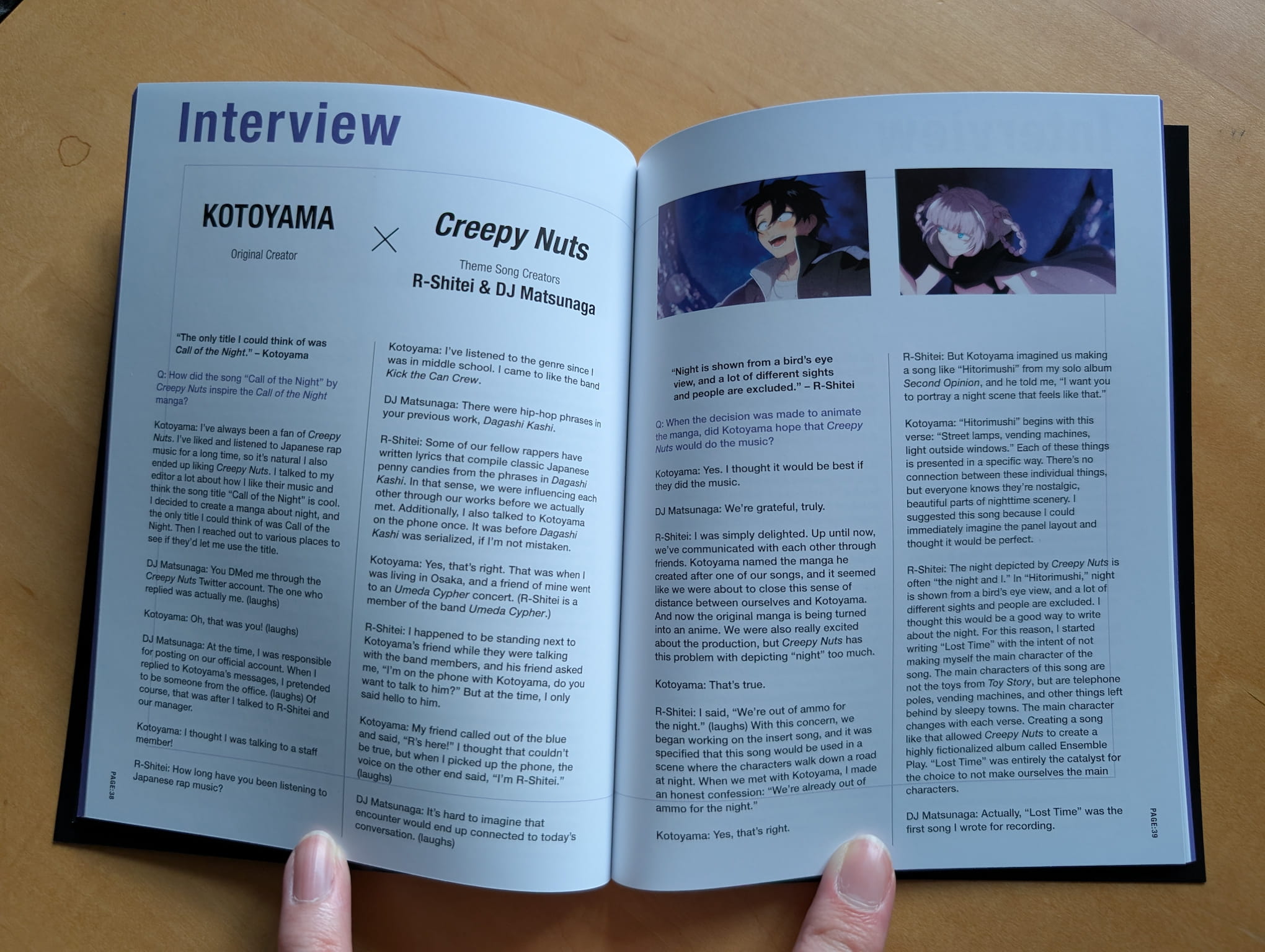 The collector’s edition release is presented with a rigid box, a Scanavo case housing the discs, a 68-page booklet, and 6 double-sided art cards. The booklet, which is the same one used in Sentai’s premium edition release, includes character designs, episode breakdowns, and interviews and discussions with the Japanese staff and Creepy Nuts.