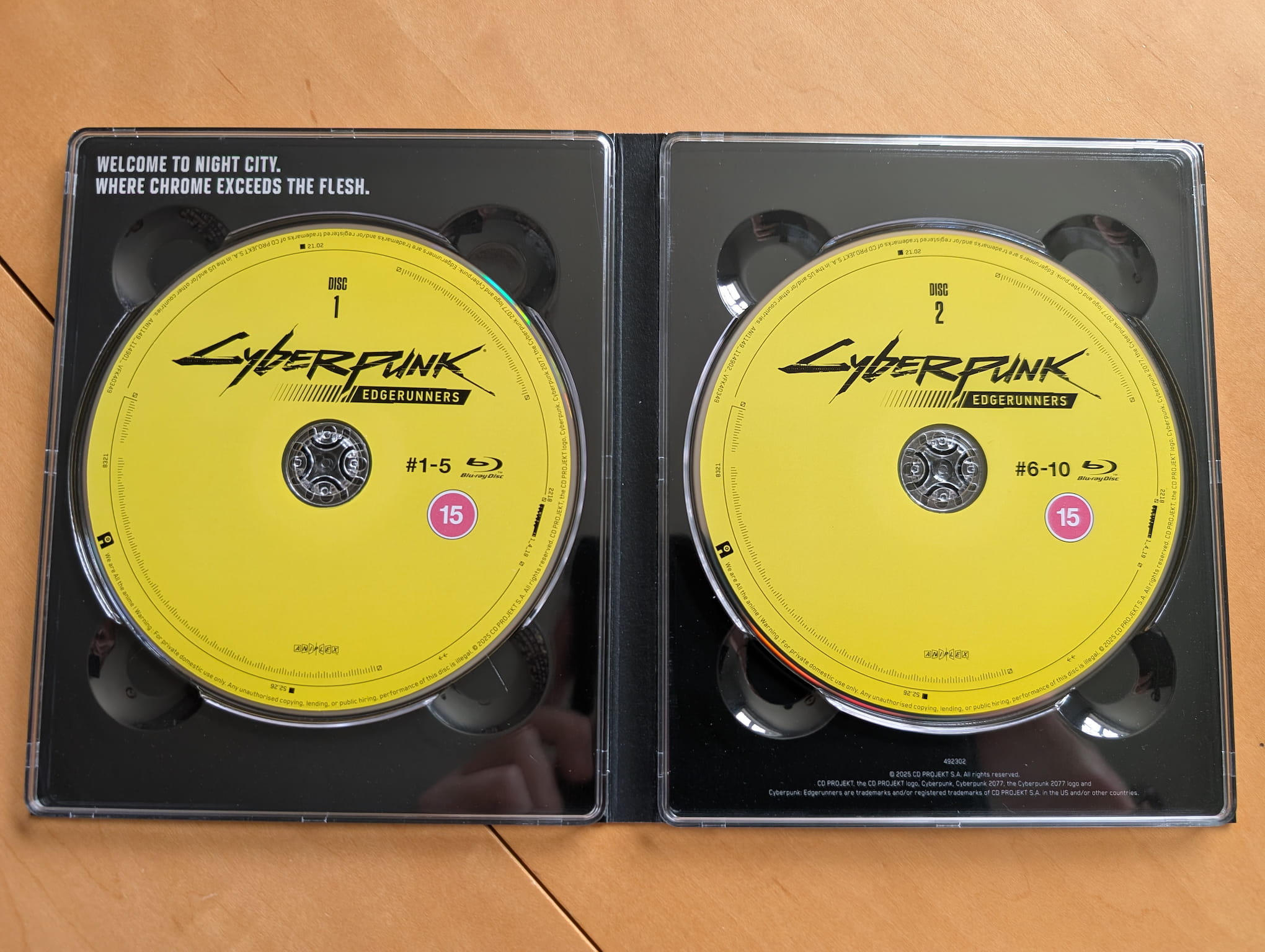 The collector’s edition Blu-ray release for Cyberpunk: Edgerunners contains all 10 episodes across two Blu-ray discs, with the encode and authoring done I believe to be done by VDMS (Plaion’s logo is on the discs as they have the rights to Europe but the menu, audio and subs are more in line with VDMS’ format compared to the previous Plaion title The Colors Within).