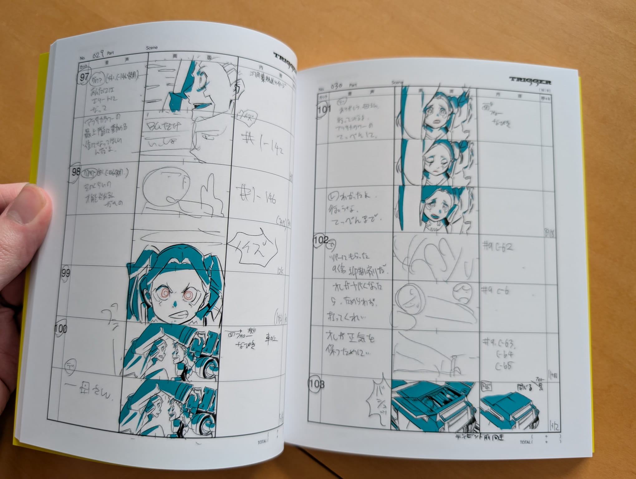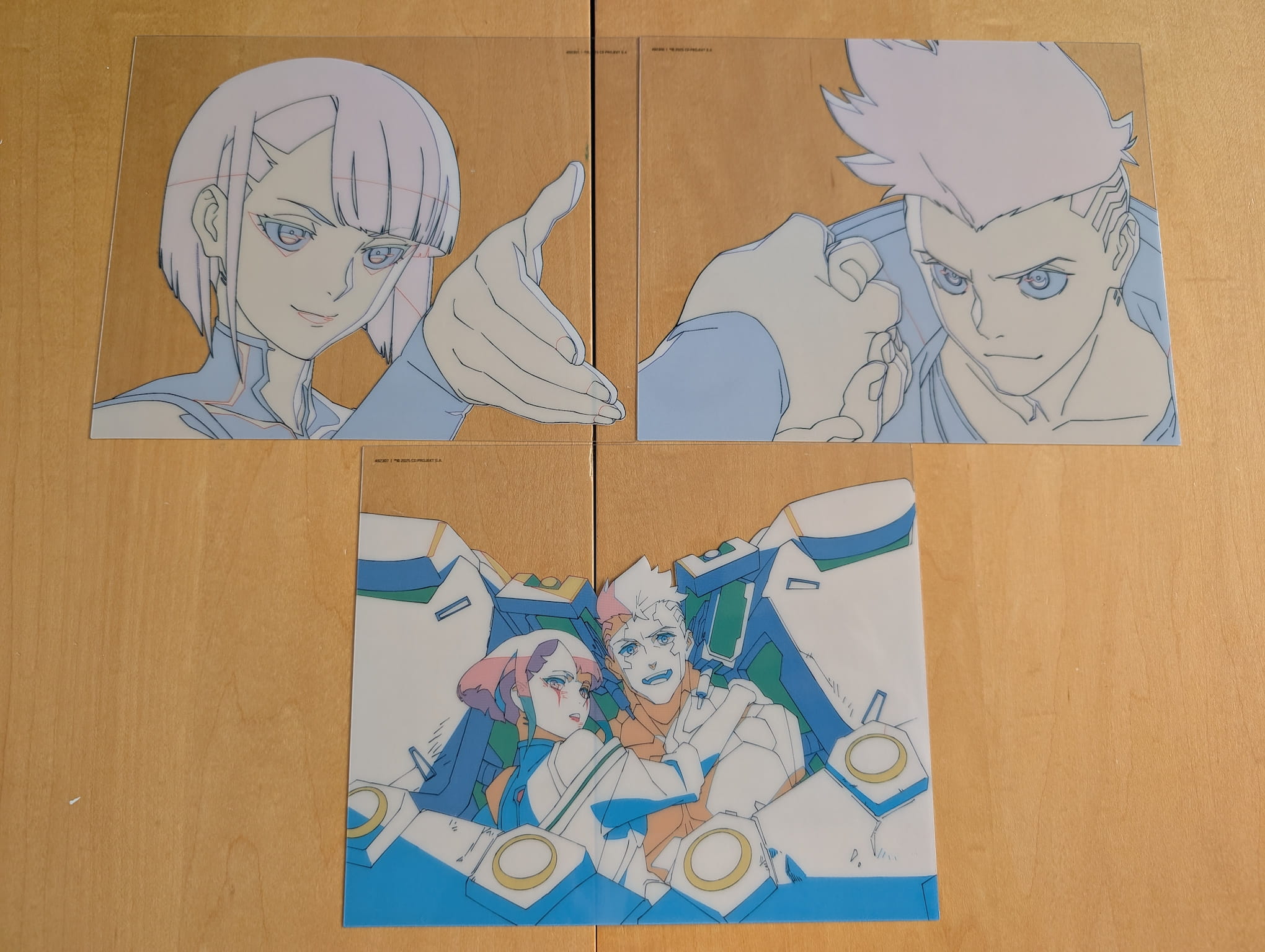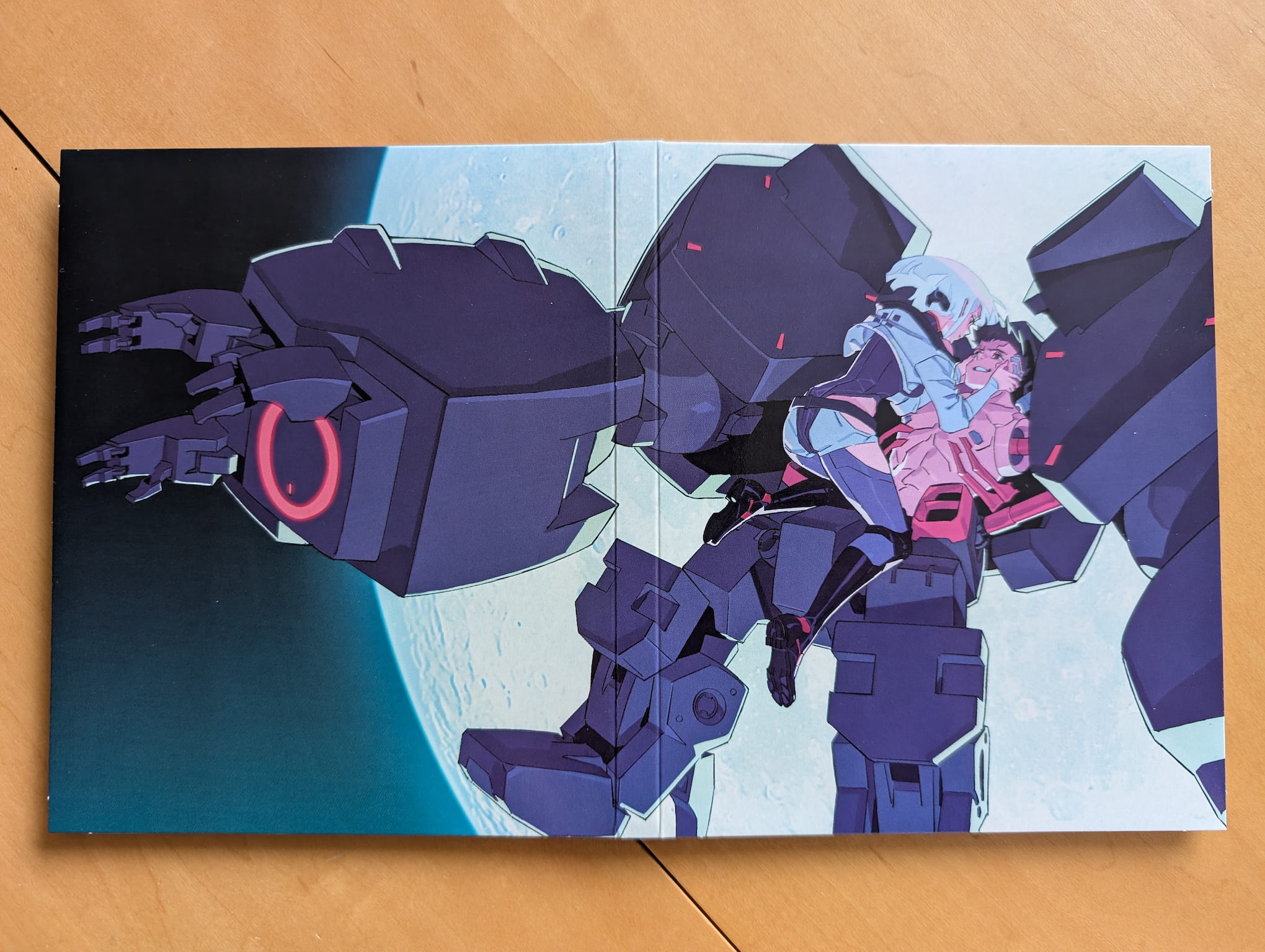The collector’s edition release is presented with a rigid box with an o-card slipcase, an digipack case housing the discs, a 48-page illustration booklet, a 112-page storyboard book focusing on the final episode of the series, a 67.2 x 35.6cm 2nd year anniversary artwork poster, 3 reproduction cells and a special metallic Lucy art card. The illustration booklet includes character designs, episode guide, key animation images and an interview with the series director Hiroyuki Imaishi.