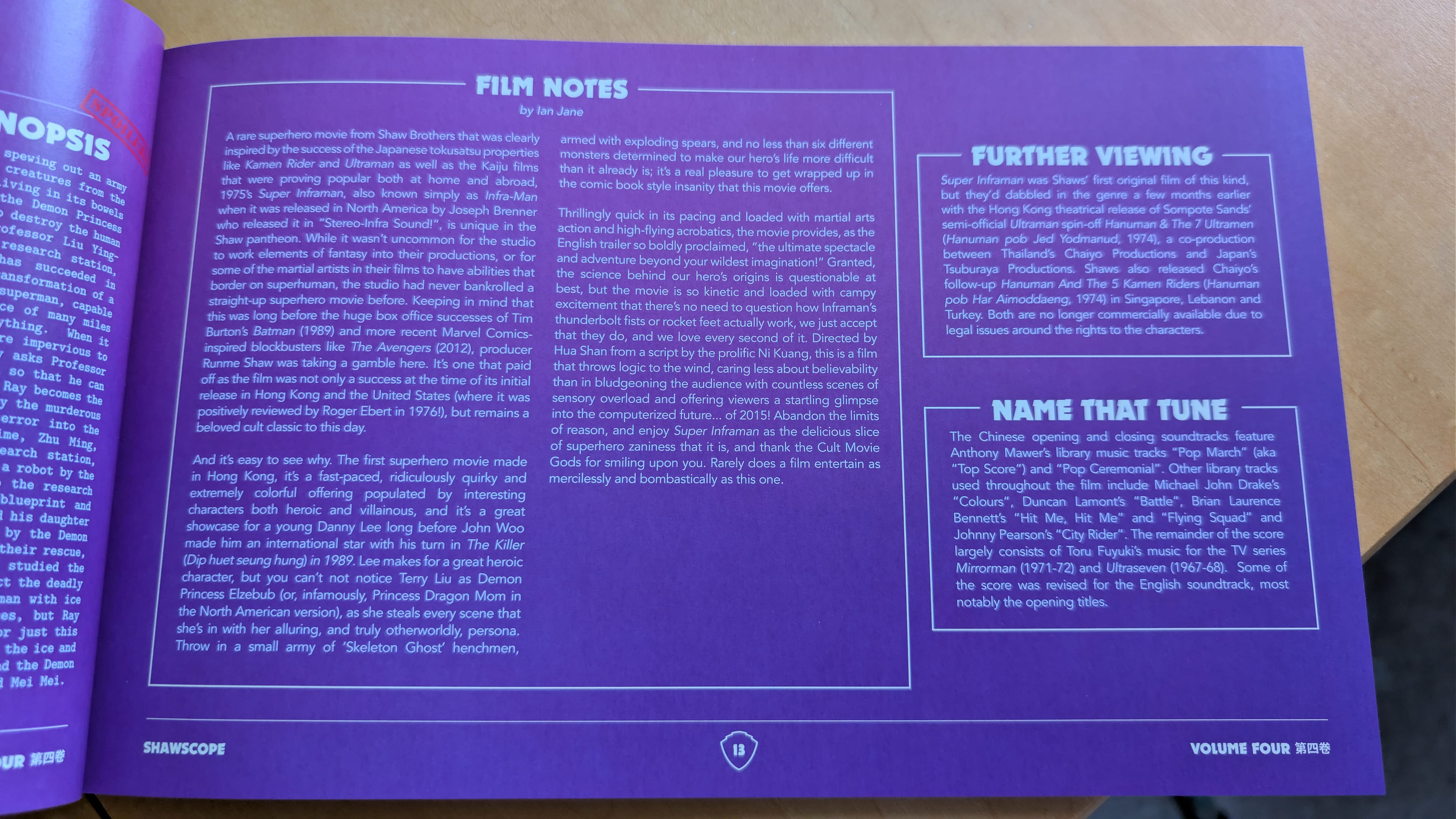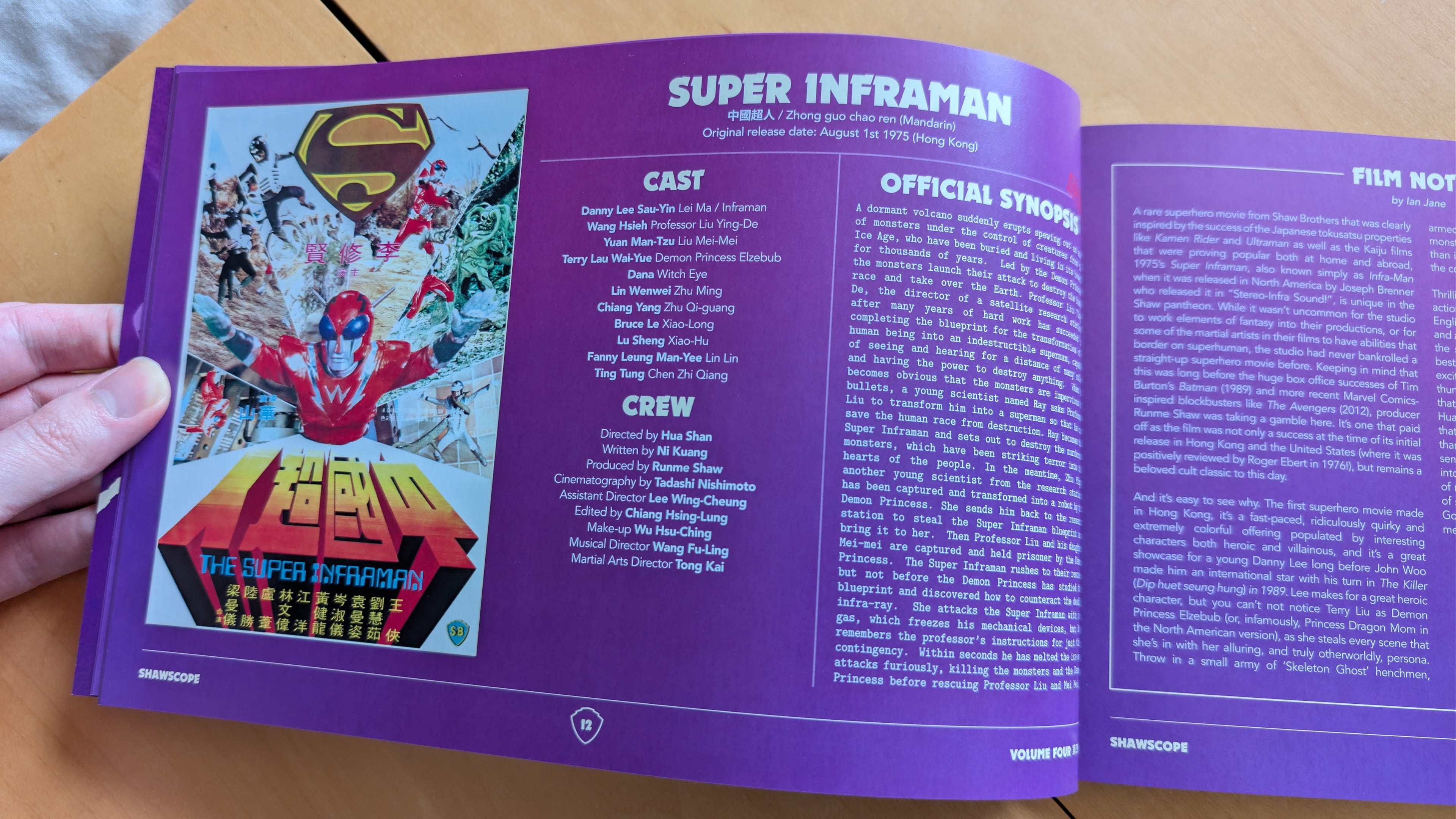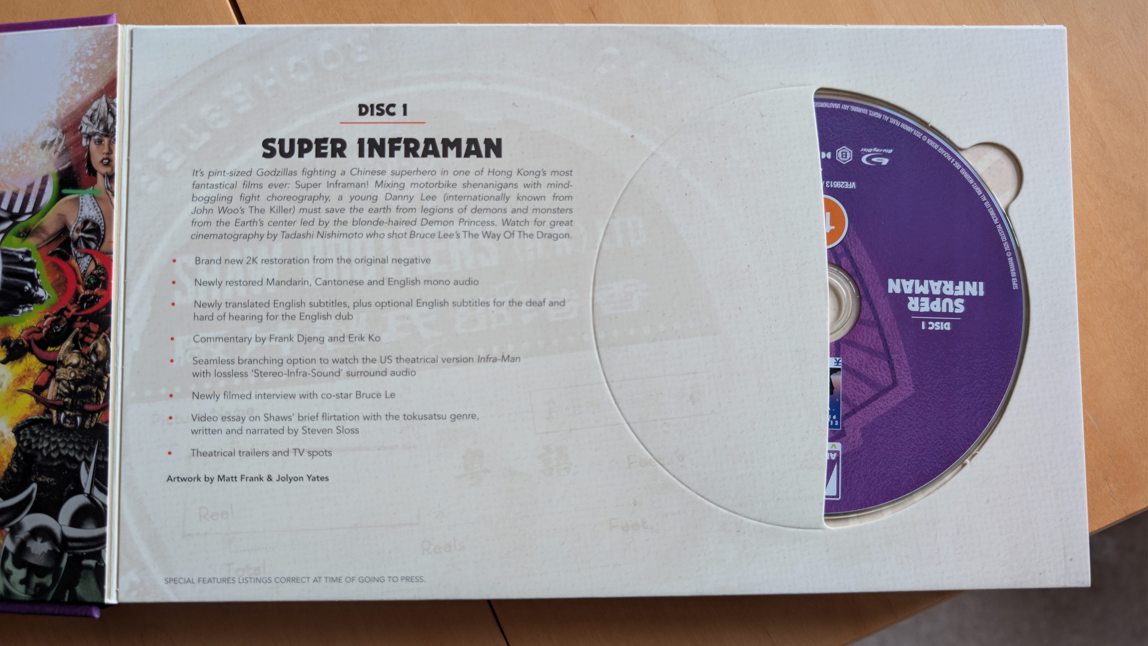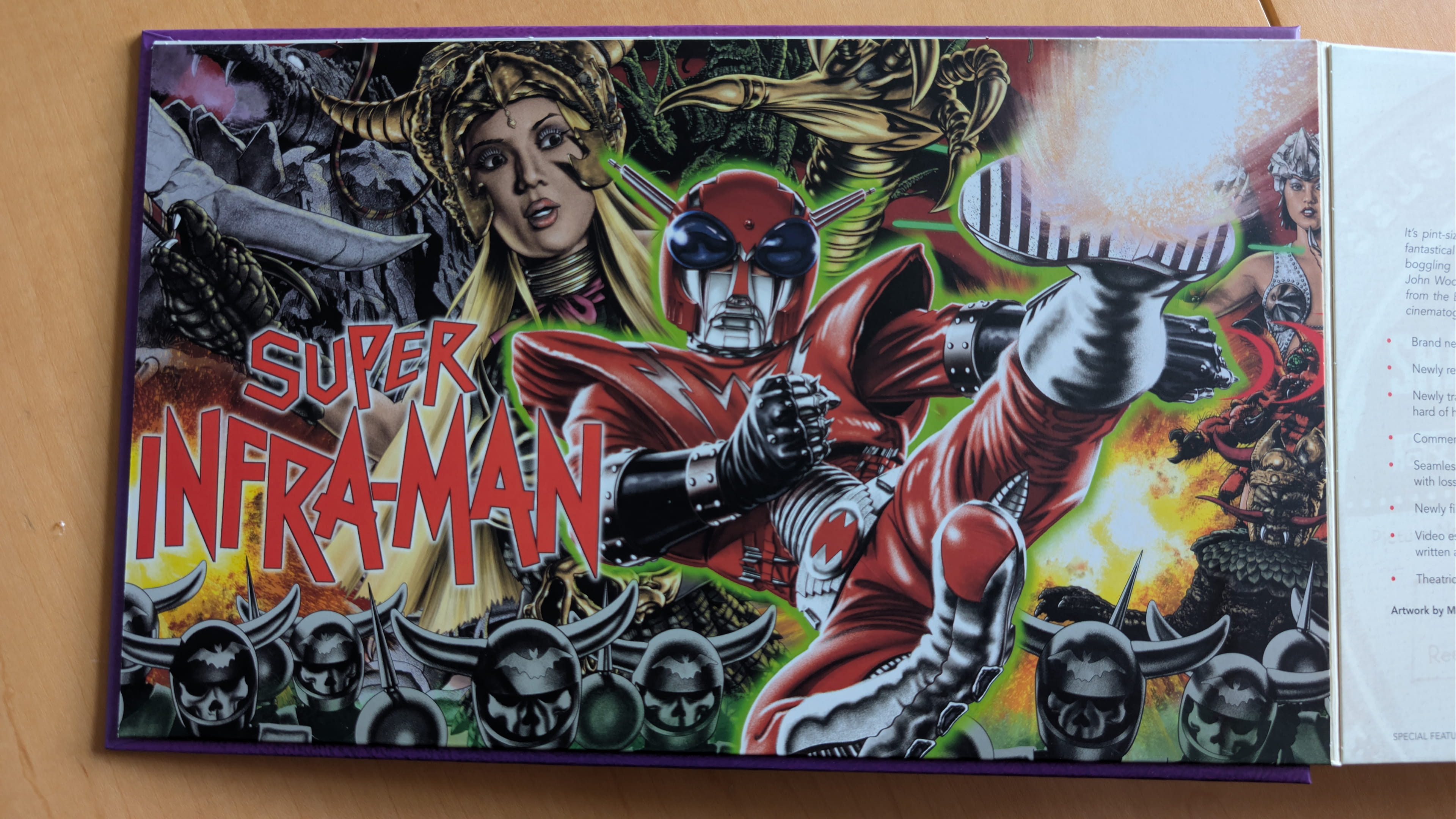 | 1 | The Super Inframan Brand new 2K restoration from the original negatives by Arrow Films Newly restored lossless Mandarin, Cantonese and English mono audio Newly translated English subtitles, plus optional hard-of-hearing subtitles for the English dub Option to view the film in its US theatrical version, Infra-man, with lossless “Stereo-Infra-Sound” surround audio |