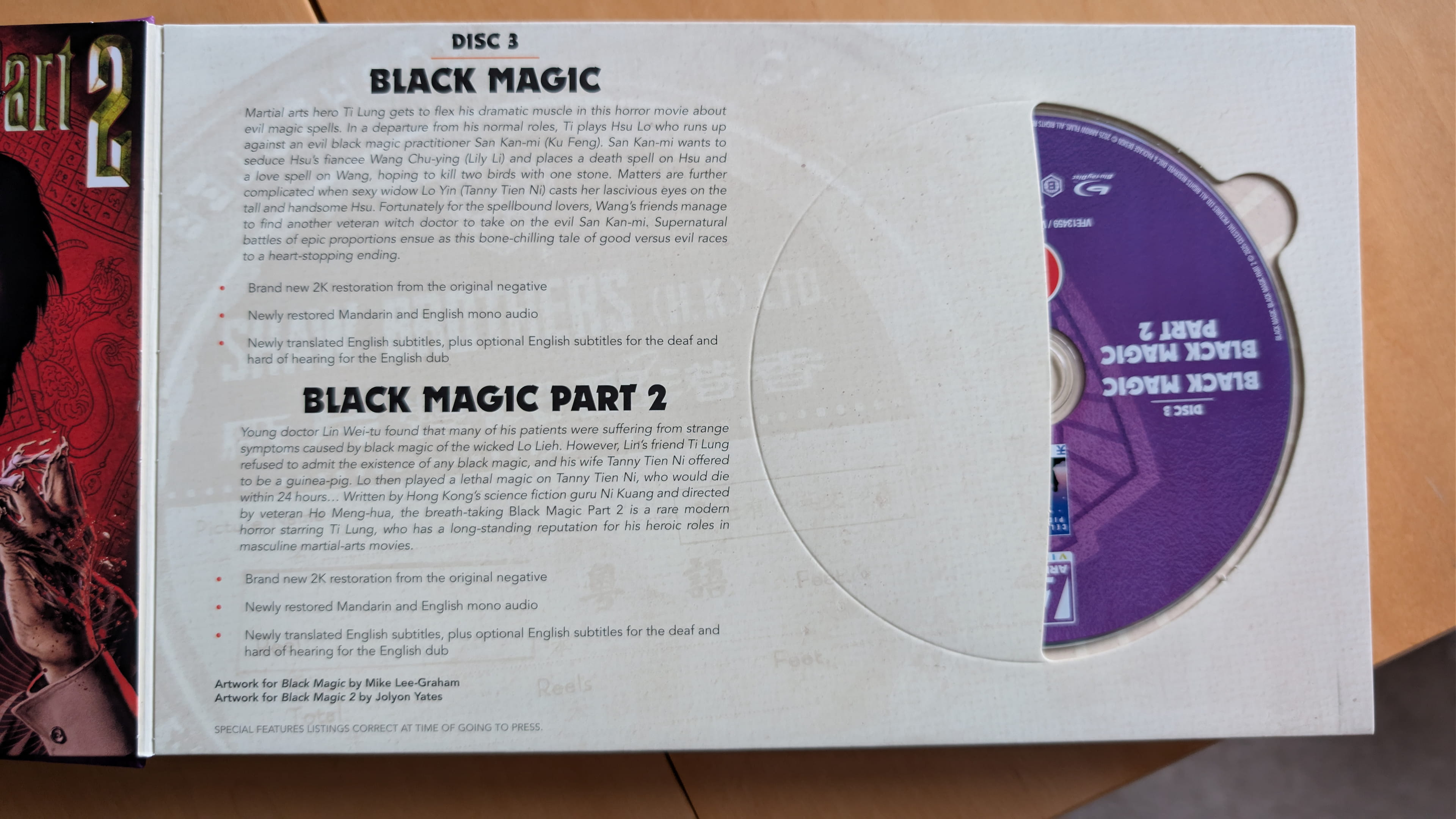 | 3 | Black Magic Brand new 2K restoration from the original negatives by Arrow Films Newly restored lossless Mandarin and English mono Newly translated English subtitles, plus optional hard-of-hearing subtitles for the English dub Black Magic Part 2 Brand new 2K restoration from the original negatives by Arrow Films Newly restored lossless Mandarin and English mono Newly translated English subtitles, plus optional hard-of-hearing subtitles for the English dub |