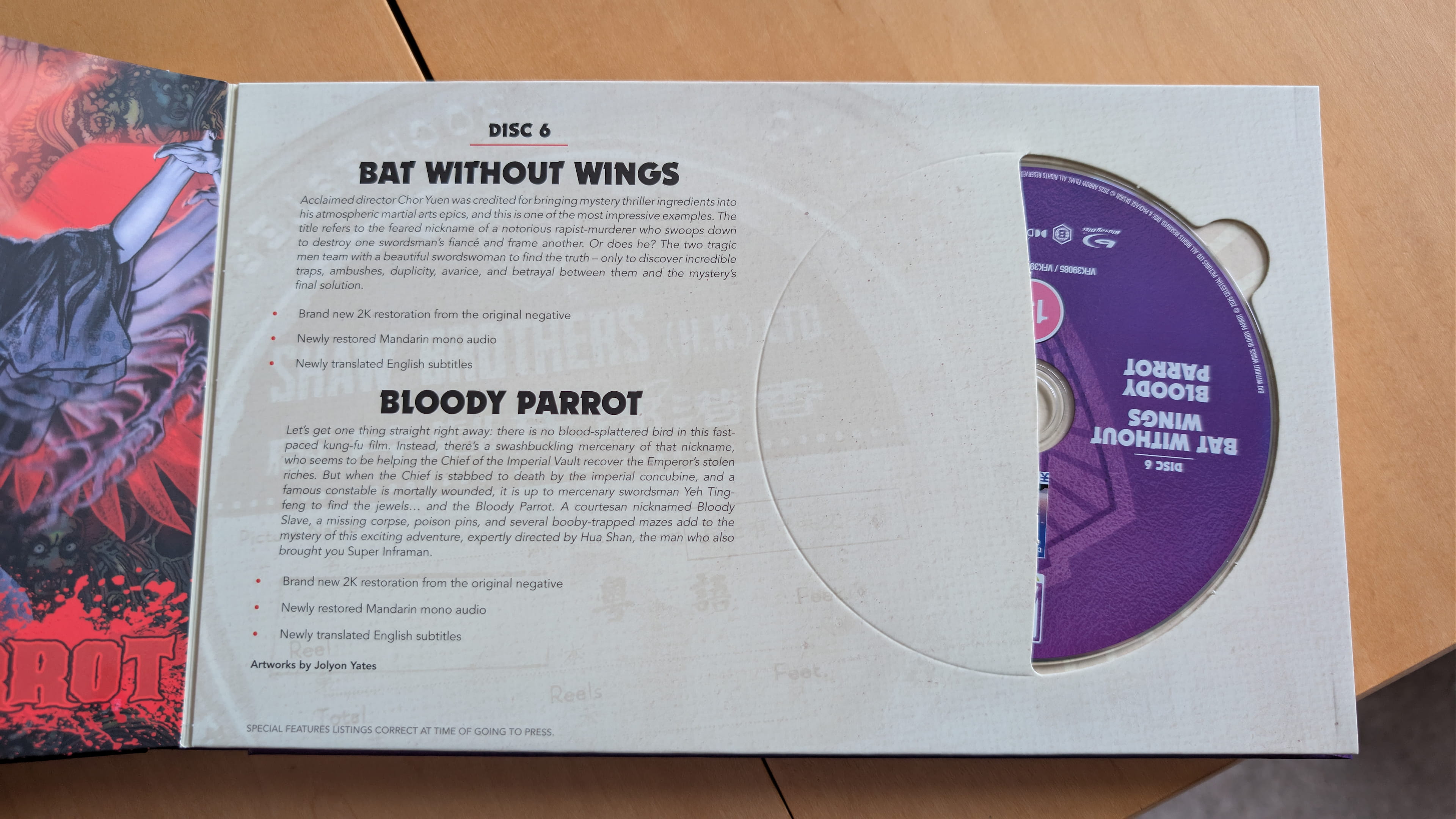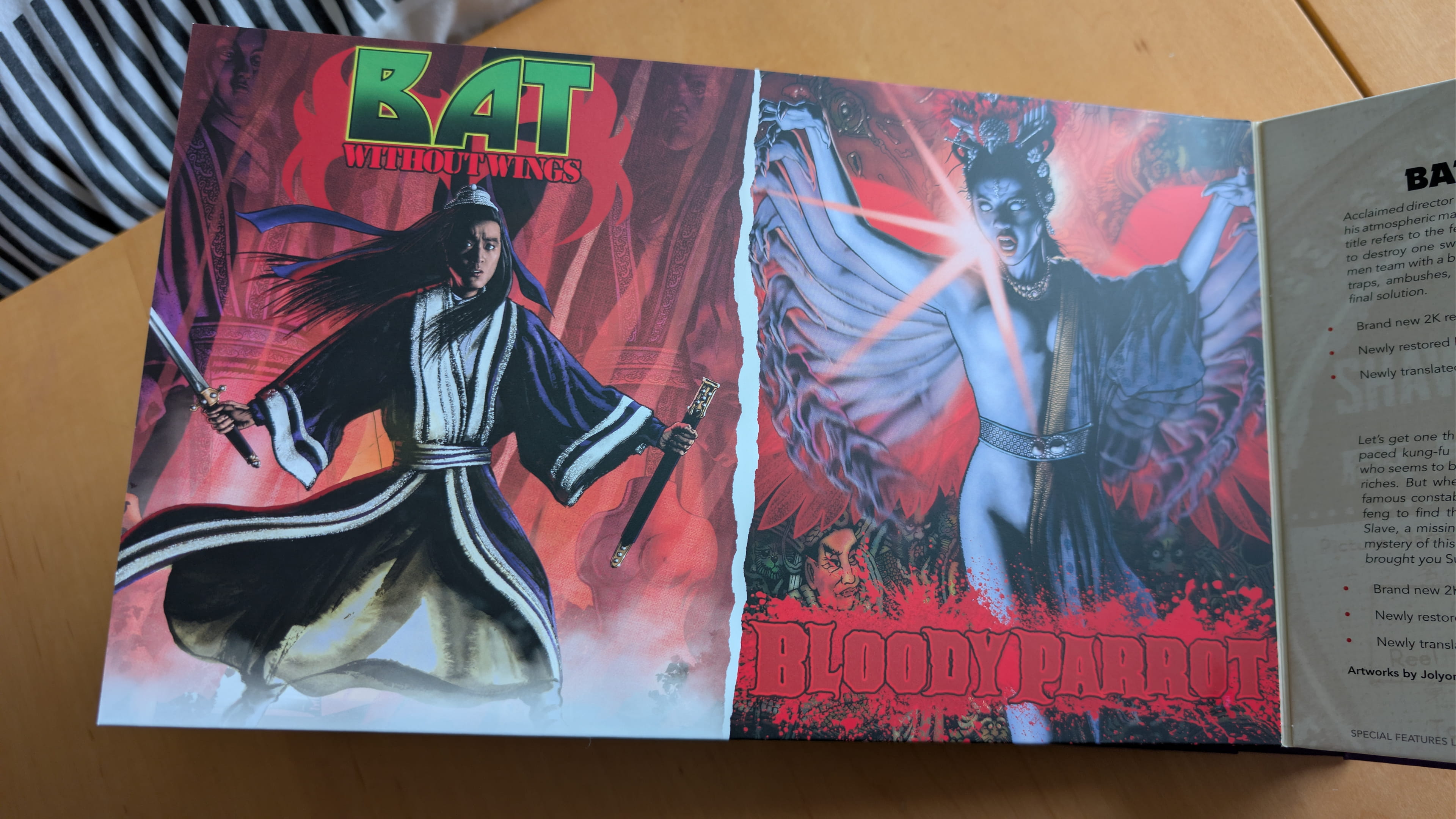 | 6 | Bat Without Wings Brand new 2K restoration from the original negatives by Arrow Films Newly restored lossless Mandarin mono Newly translated English subtitles Bloody Parrot Brand new 2K restoration from the original negatives by Arrow Films Newly restored lossless Mandarin mono Newly translated English subtitles |