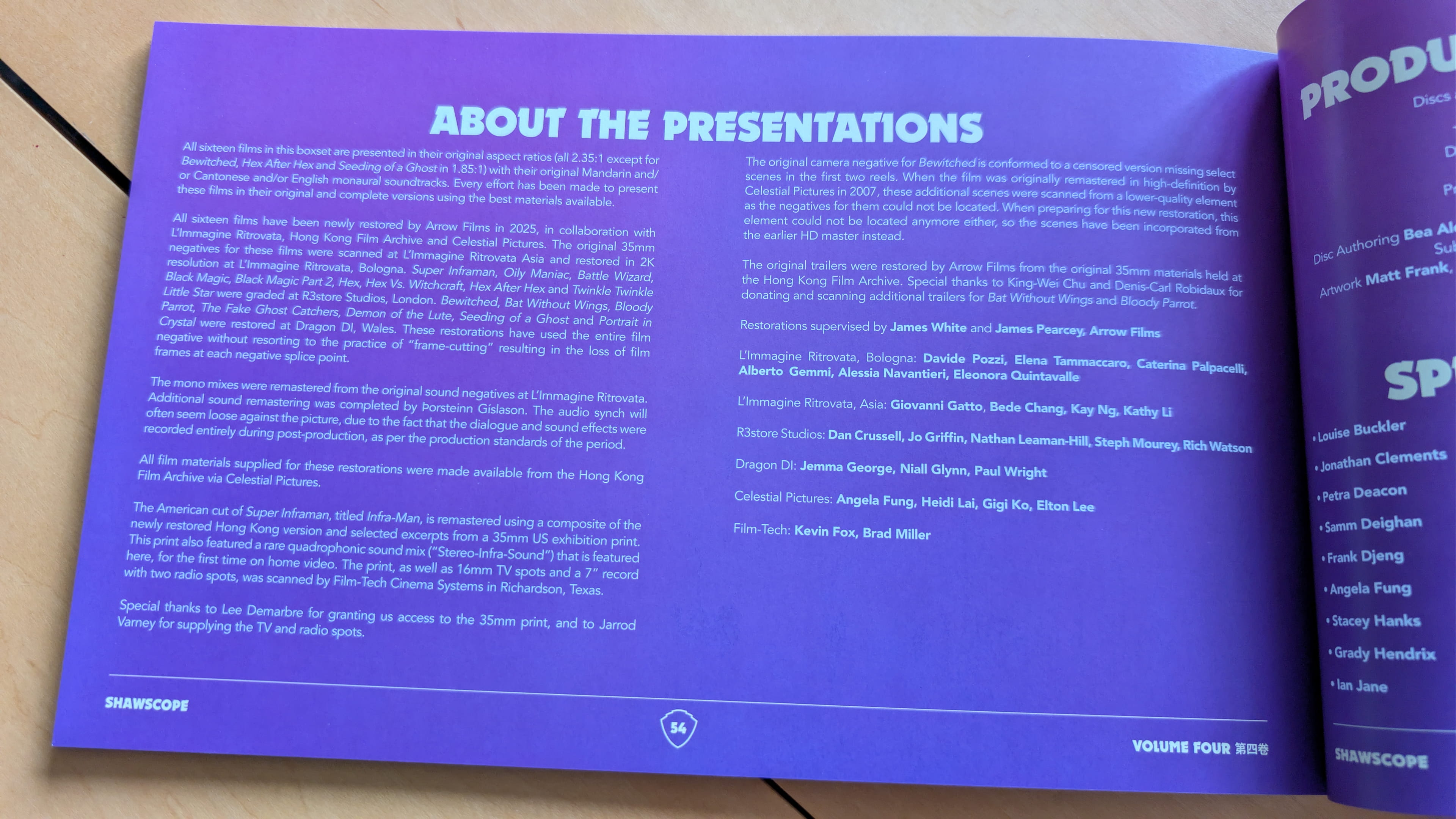 The limited edition release for Shawscope Volume 4 contains 16 films across 9 Blu-ray discs plus an additional Blu-ray disc for more bonus features. Each disc has different restorations/transfers, audio and bonus feature content.