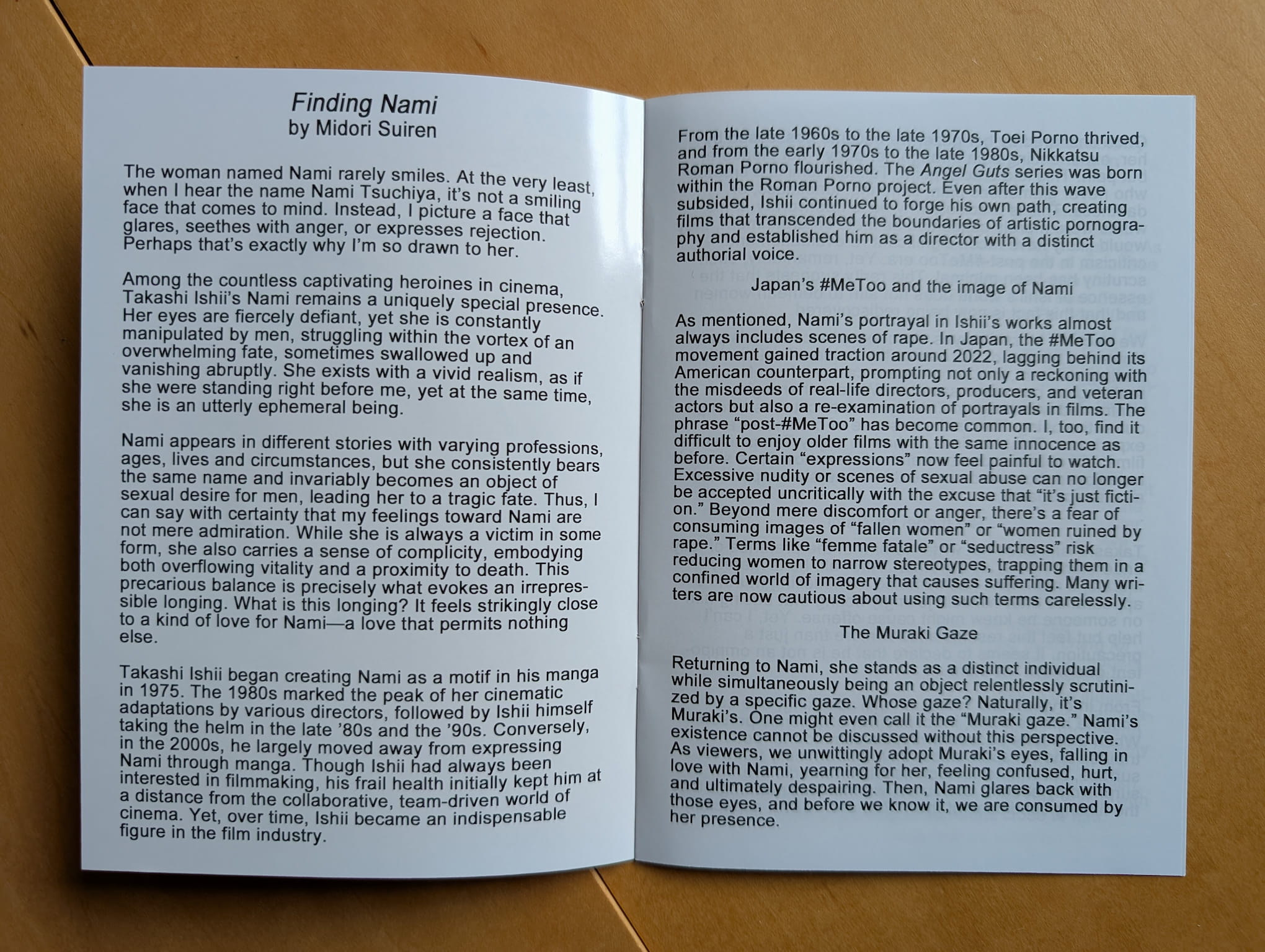 Angel Guts: Nami (天使のはらわた 名美, Tenshi no Harawata: Nami) is a 1979 film directed by Noboru Tanaka (Night of the Felines, Watcher in the Attic), written by Takashi Ishii, with editing by Akira Suzuki (Branded to Kill, Tampopo), cinematography by Masaru Mori (Assault! Jack the Ripper, A Tale of Sorrow and Sadness) and music composed by Abirisu.