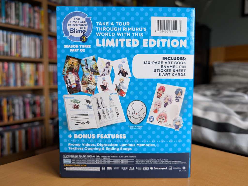 The limited edition release for That Time I Got Reincarnated as a Slime Season 3 Part 2 contains episodes 13-24 (episodes 61-72) across two Blu-ray discs and two DVD discs, with the encode and authoring done by Crunchyroll.