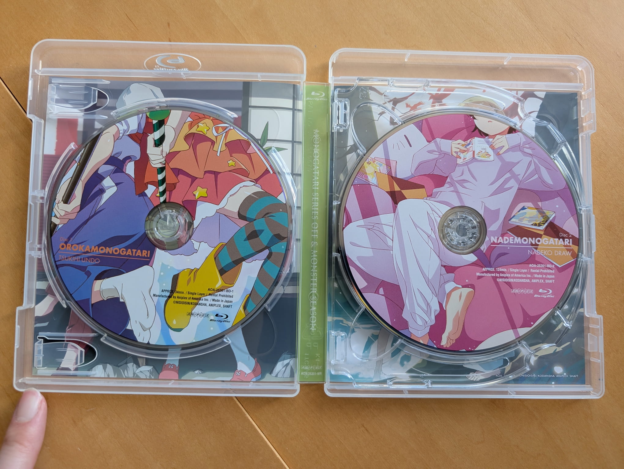 The limited edition Blu-ray release for Monogatari series: Off & Monster Season contains all 14 episodes plus the A Cruel Fairy Tale: The Beautiful Princess ONA special across four Blu-ray discs; one for each story arc with Disc 1 for Orokamonogatari (Episode 1), Disc 2 for Nademonogatari (Episodes 2-6), Disc 3 for Wazamonogatari (Episodes 7-8 & Special) and Disc 4 for Shinobumonogatari (Episodes 9-14). The discs were authored and encoded by Aniplex of America.