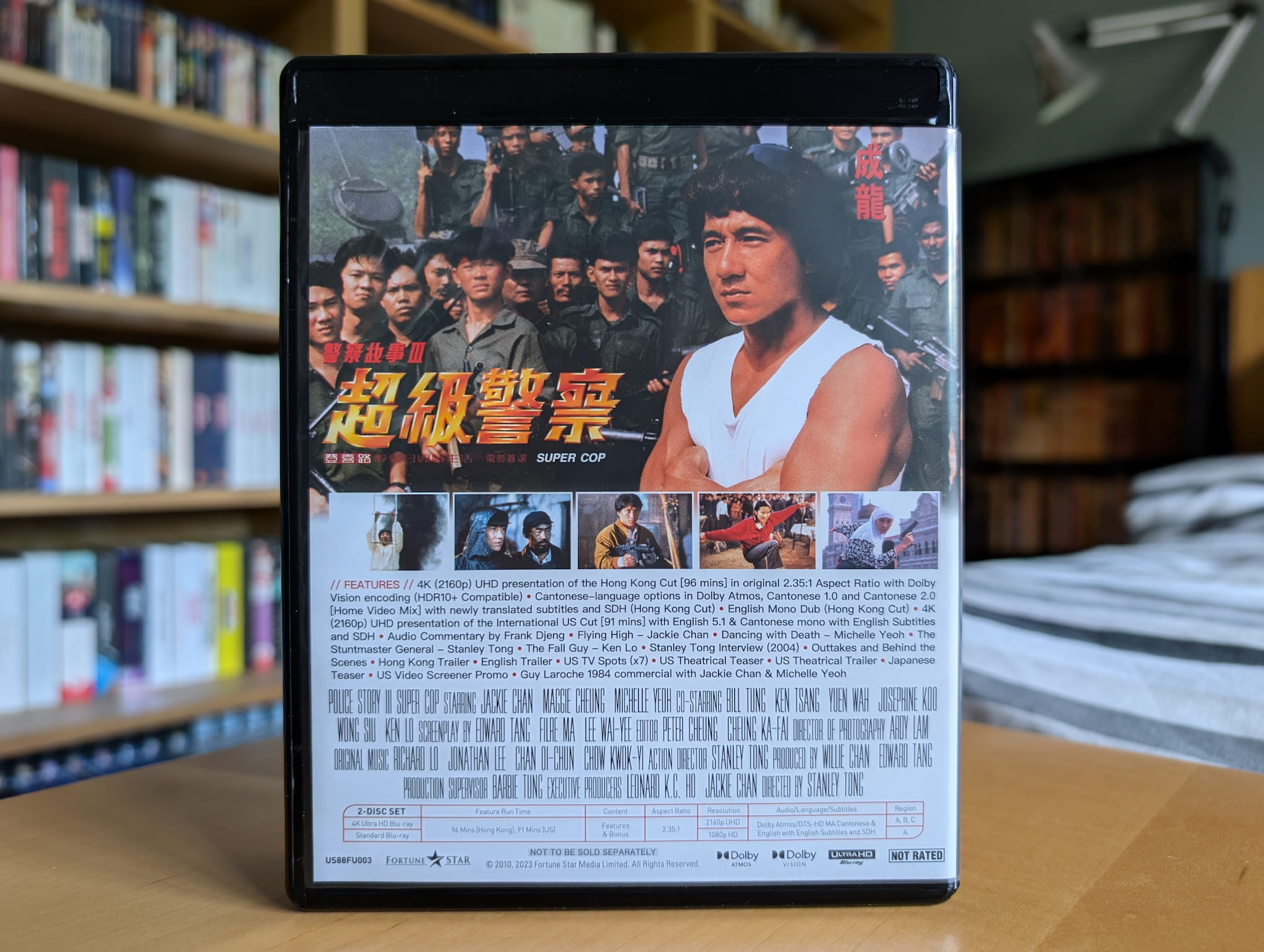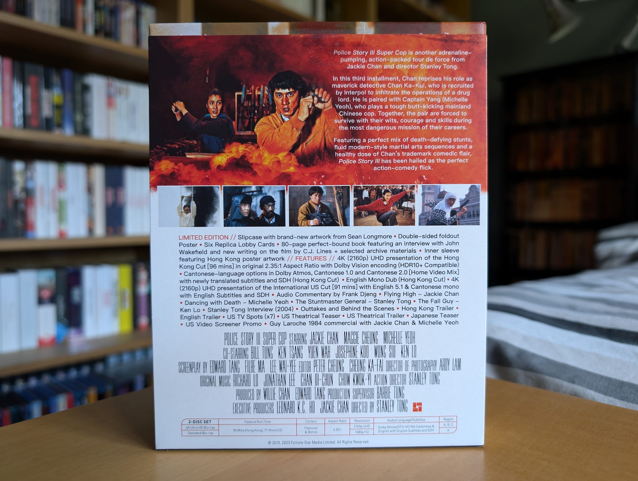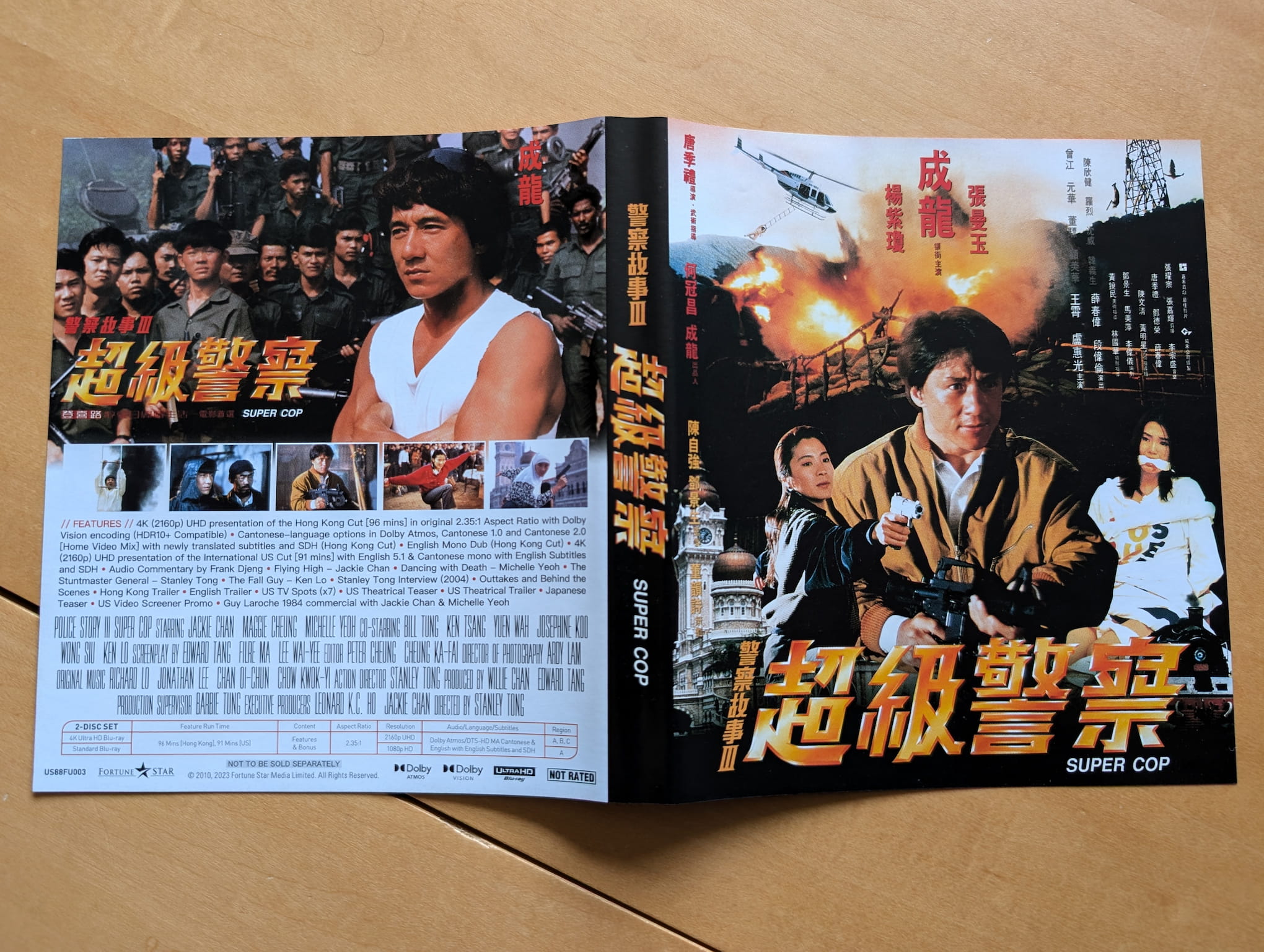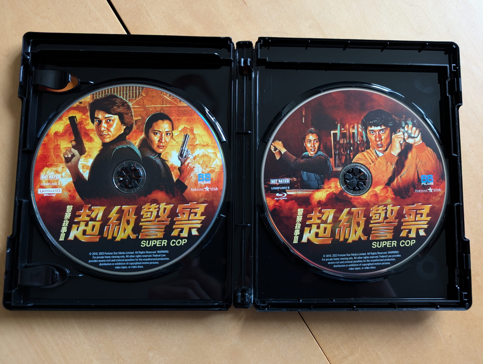 The deluxe limited edition release for Police Story 3: Supercop contains the film on a single 4K Ultra HD disc and single Blu-ray disc. All the discs were encoded and authored by Fidelity in Motion on behalf of 88 Films.