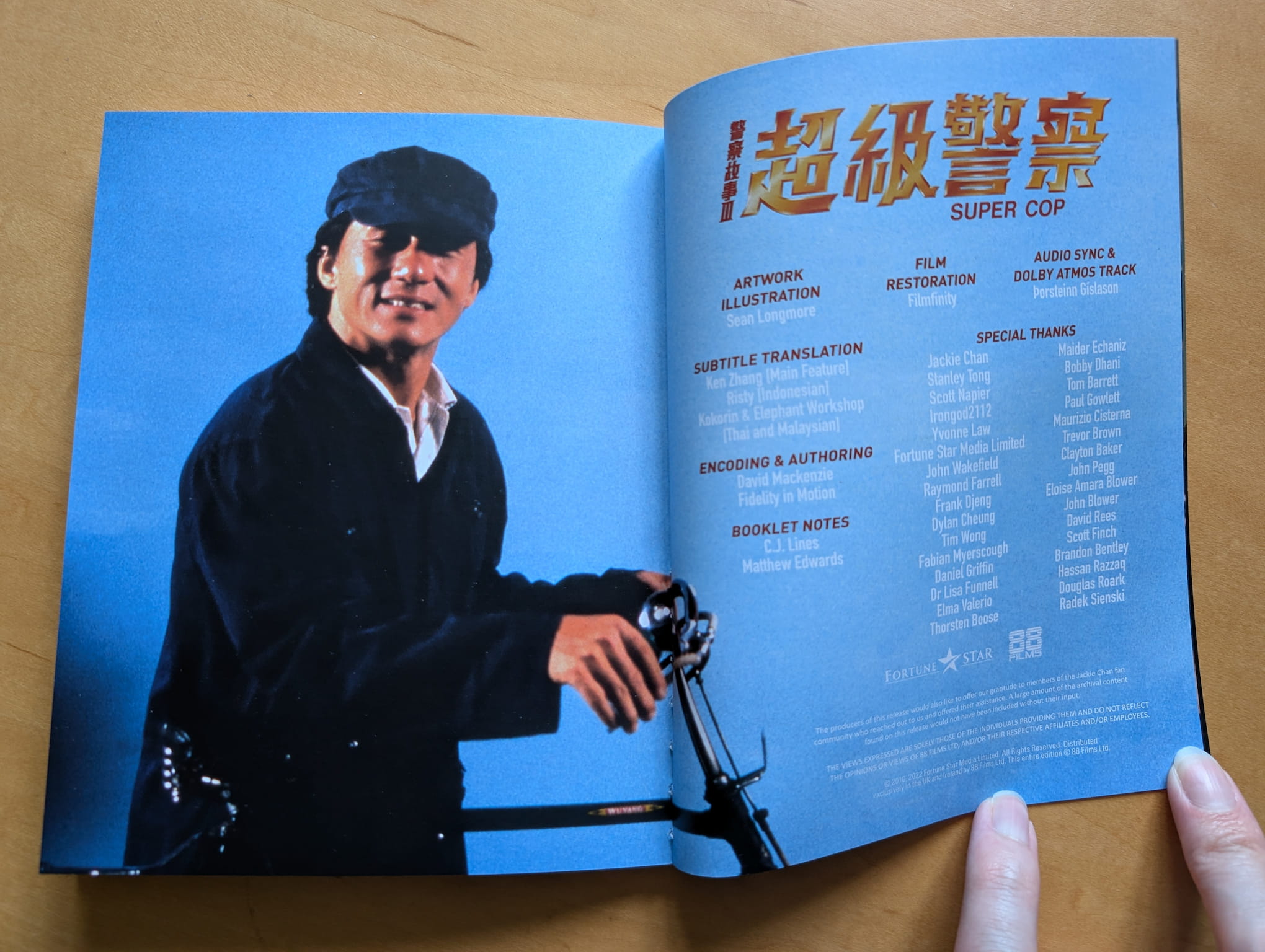 This deluxe limited edition release is presented with a rigid box featuring newly illustrated artwork by Sean Longmore, a 4K Ultra HD Amaray case housing the discs, 6 lobby card reproductions, a double-sided poster featuring the original Hong Kong poster artwork and the original Japanese poster artwork, and an 80-page perfect-bound book featuring two write-ups. The articles covered are ‘Meet the cop that can’t be stopped! An Interview with John Wakefield’ by Matthew Edwards and ‘Threenage Kicks: The Joy of Supercop’ by C.J. Lines.